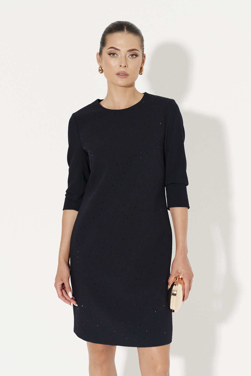 Платье женское из смесовой ткани для повседневной носки полуприлегающего силуэта. Перед имеет две нагрудные вытачки. Перед украшен мерцающими стразами. Спинка со средним швом и потайной зестежкой-молнией в шве. Рукава чуть ниже локтя и небольшими разрезами по локтевому шву. Очень изысканное платье на все случаи жизни, комфортное в носке и с безупречной посадкой по телу.Размер 44: Длина изделия - 97см, Длина рукава - 44см, Ширина плеча - 12см, Ширина по бедрам - 51см, Ширина по груди - 48см, Ширина рукава - 16,5см;