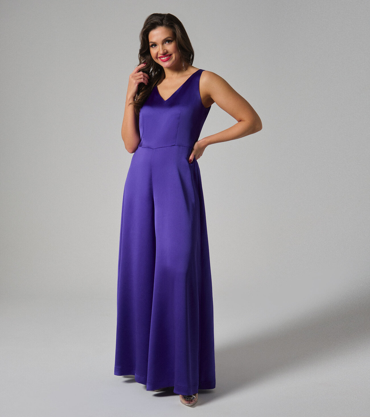 Комбинезон нарядный из костюмной ткани с нарядным блеском модного кроя. Комбинезон без рукавов. Отрезной по линии талии. Брюки расширенные к низу. По спинке застежка на одну потайную пуговицу. Разрез, переходящий в застёжку на потайную молнию. В этом наряде вы будете красивы и грациозны! Наряд с максимальным комфортом.Размер 42: Высота посадки - 34см, Длина брюк - 109см, Длина по внутреннему шву - 78,5см, Длина спинки - 36см, Ширина брючин сверху - 170см, Обхват брюк по низу - 139см, Ширина плеча - 3см, Ширина по бедрам - 57см, Ширина по груди - 44см, Ширина по талии - 37см;