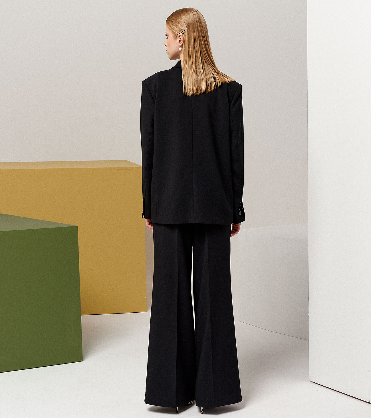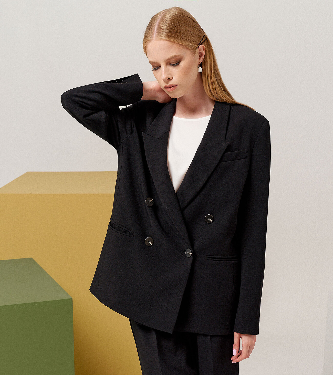 Удлиненный жакет прекрасно дополнит брюки в деловом стиле, уже имеющиеся в вашем арсенале модной одежды. Пиджак женский оверсайз имеет достаточно свободный крой, не подразумевает посадку по фигуре. Вы можете носить деловой жакет как самодостаточный элемент, поддевая под низ нижнее белье, топ, однотонную футболку, майку. Черный двубортный жакет женский – брючный вариант. Поэтому он хорошо смотрится с узкими и широкими штанами. Выполнен жакет из трикотажа, хорошо держит форму. Вы можете купить черный классический пиджак по выгодной цене в размерах 42-50.Размер 42: Длина изделия - 70см, Длина рукава - 62см, Ширина плеча - 13,1см, Ширина по груди - 52см, Ширина по низу - 53см, Ширина рукава - 17,7см;