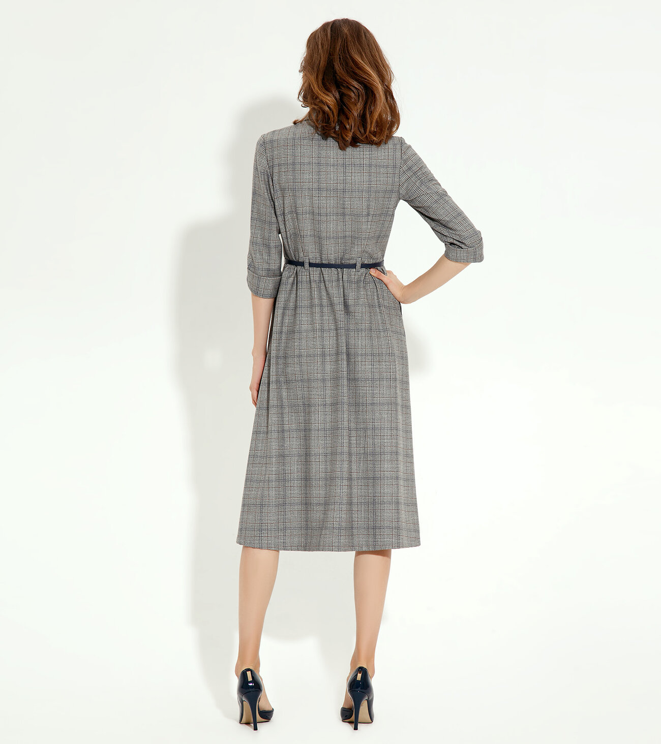 Элегантное стильное платье построеное на сочетании стильной клетки в пастельных тонах и фурнитуры в виде тёмных акцентов . Платье отрезное по линии талии с расклешенной юбкой .Длина ниже колена и с внутренними карманами по бокам.Талия посажена на резинку. Лиф прилегающий с рубашечным воротником и застёжкой на планке на кнопки до талии. Рукав втачной с притачным мандетом по низу При помощи паты длину рукава можно регулировать.Размер 42: Дл.спины от высшей плечевой точки до талии - 41см, Длина изделия - 113см, Длина рукава - 47,5см, Обхват шеи - 42,5см, Ширина плеча - 10,7см, Ширина по груди - 45,5см, Ширина по талии - 34,5см, Ширина рукава - 16см;