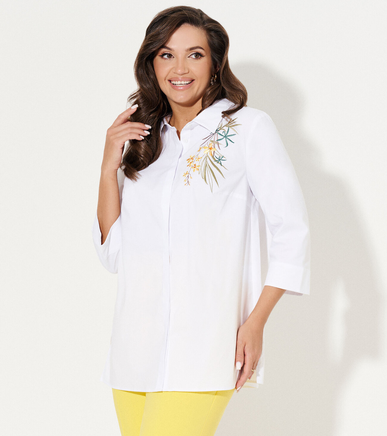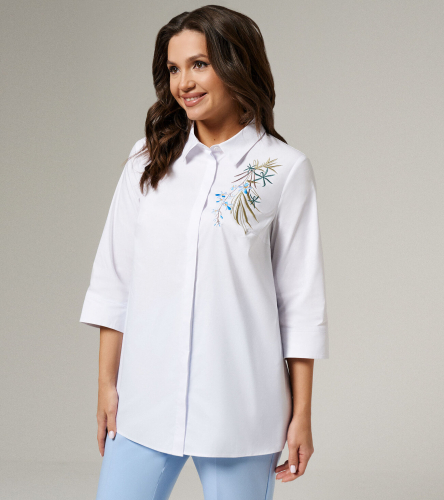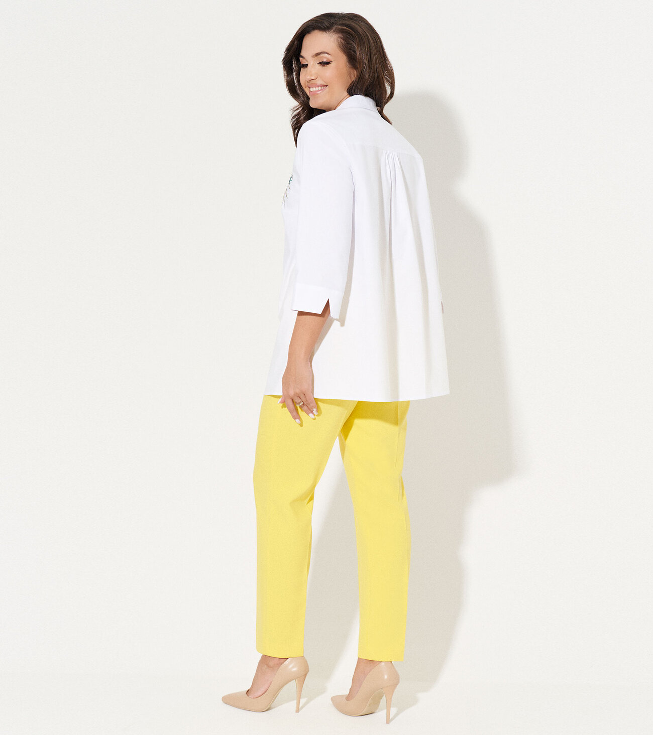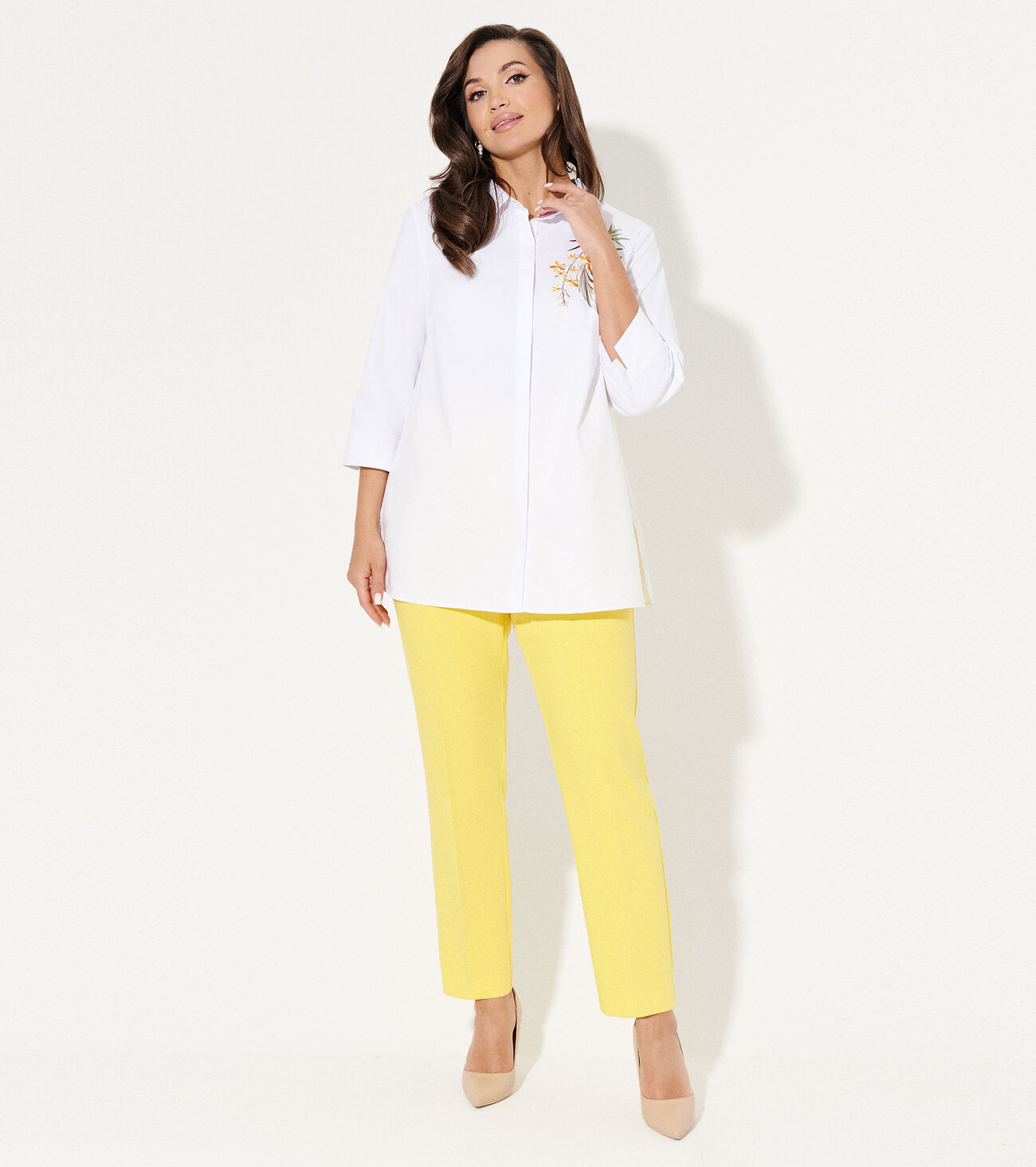 Комплект женский из хлопковой ткани для повседневной носки. В комплект входят блуза и брюки. Блуза полуприлегающего силэта с фронтальной застежкой на пуговицы. Воротник- стойка. Рукав блузы укорочен и оформлен притачной манжетой. По переду блузы вышика. По спинке отрезная кокетка. Брюки на поясе, зауженные к низу. В боковых частях пояса вставлена резинка. Застегиваются на тесьму-молнию и пуговицу.Размер 50: Длина изделия - 72.5см, Длина рукава - 45.5см, Обхват шеи - 50см, Ширина плеча - 12см, Ширина по бедрам - 65.5см, Ширина по груди - 58.5см, Ширина рукава - 20см; Брюки
