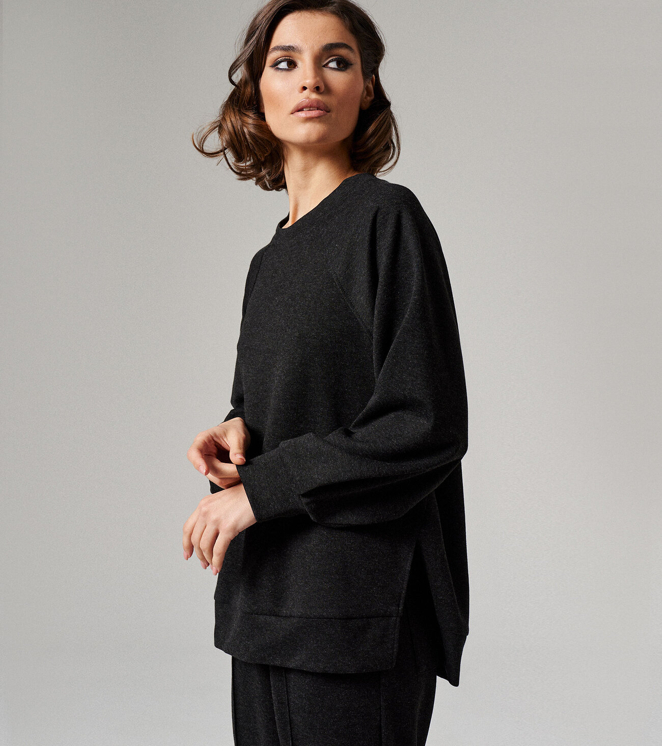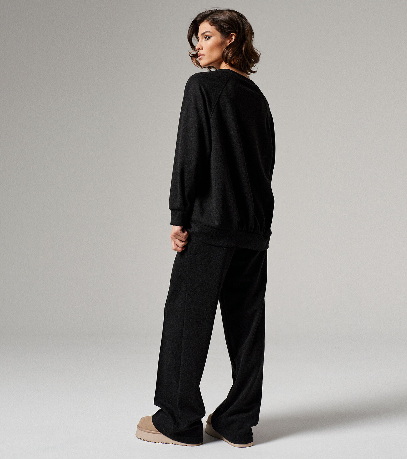 Комплект женский из трикотажа для повседневной носки. Комплект состоит из джемпера и брюк. Брюки на резинки прямые свободные, с боковыми карманами в боковых швах. На задней части брюк накладные карманы. Джемпер с длинным рукавом реглан и разрезами в боковых швах.Размер 42: Длина изделия от высшей плечевой точки до низа - 71см, Длина рукава - 70см, Ширина по груди - 56см, Ширина по низу - 53см, Ширина рукава - 26см; Брюки