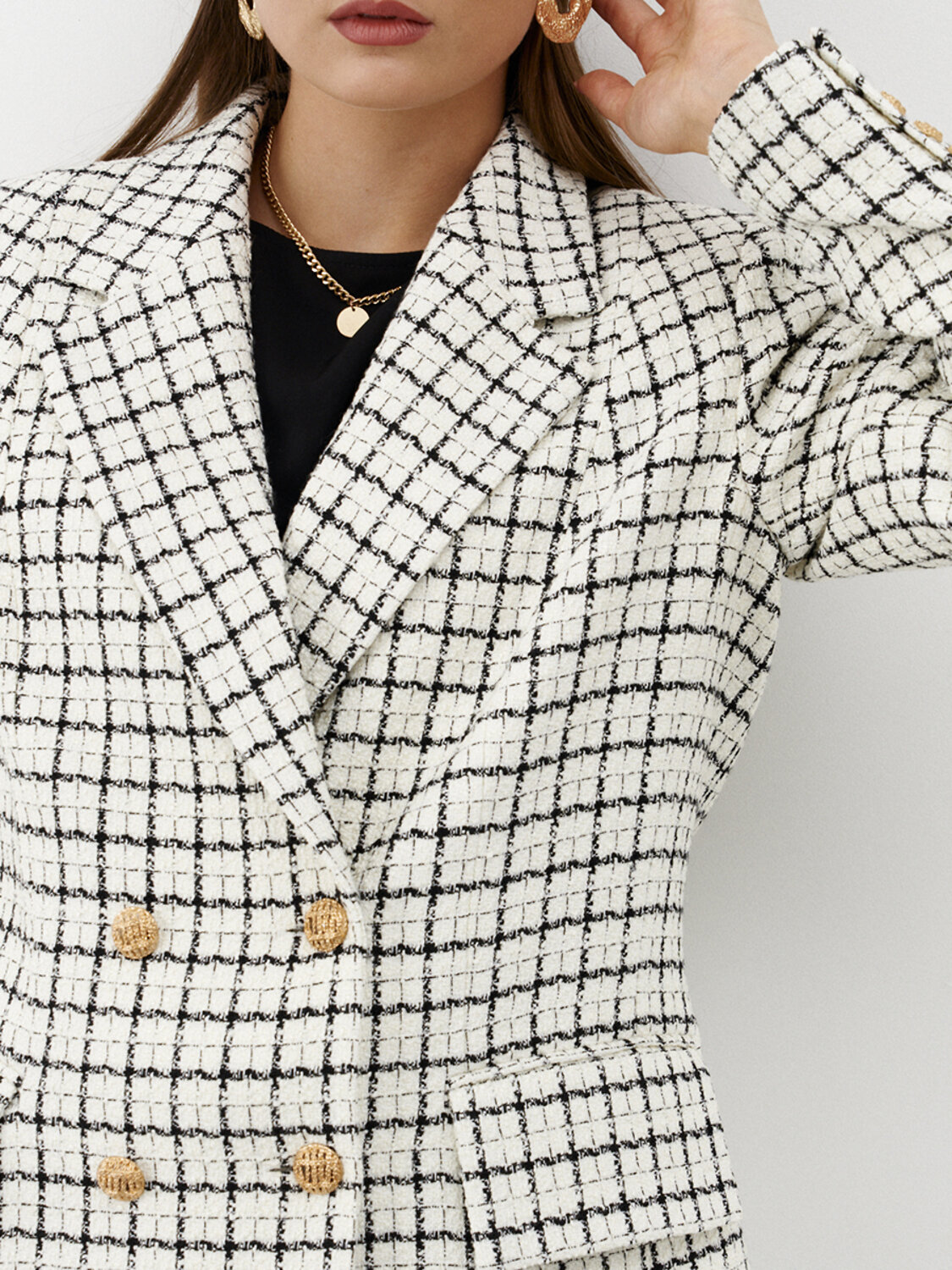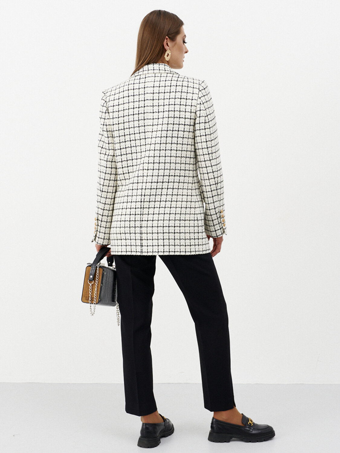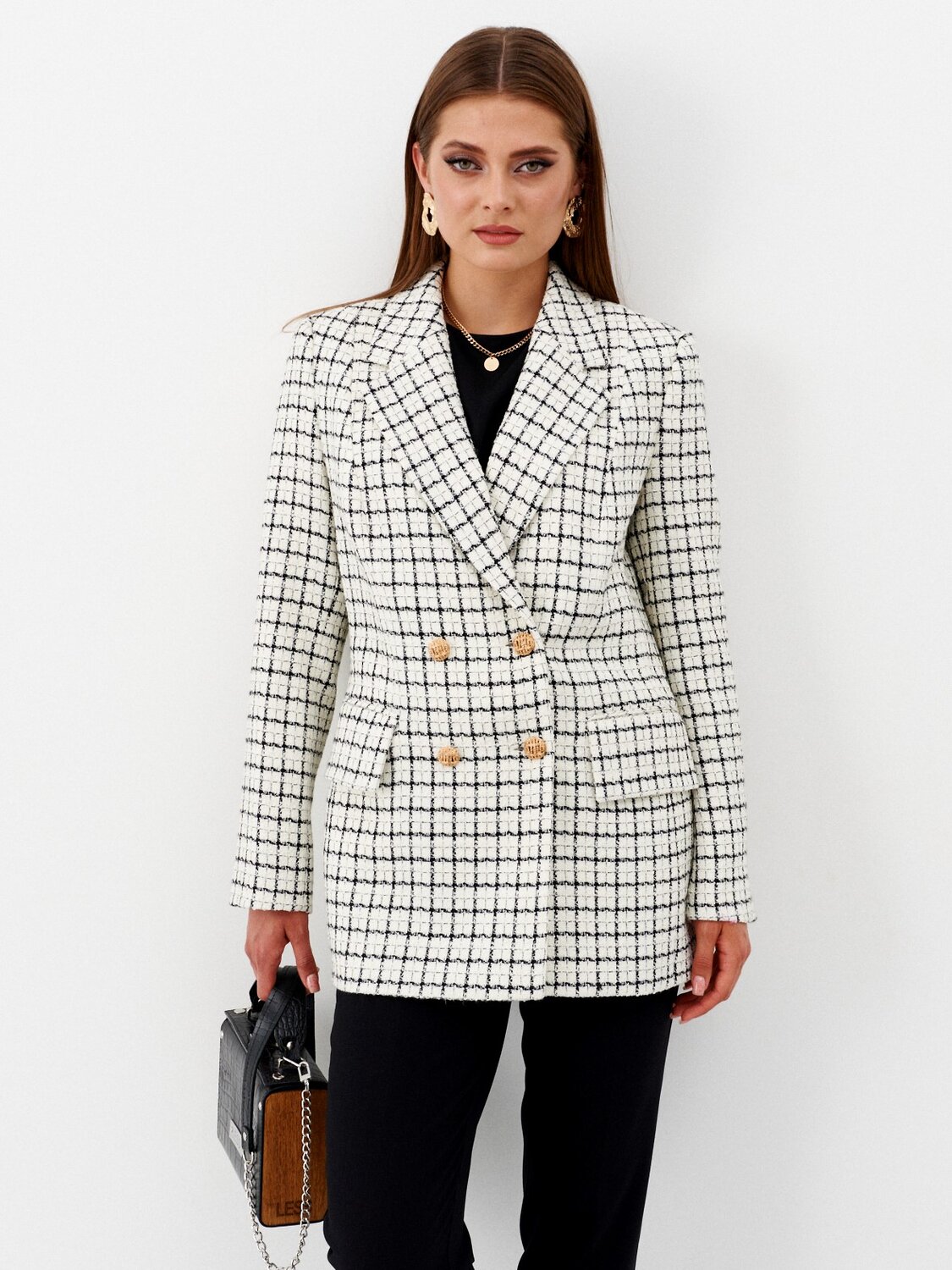 Жакет женский бренда Ketty для повседневной носки, из ткани-твид, на подкладке, полуприлегающего силуэта с втачным рукавом и английским воротником. Перед дополнен двумя прорезными карманами с клапанами. Двубортная застежка на четыре золотые пуговицы. Женский удлиненный жакет создан для стильных девушек и женщин. Длинный базовый пиджак двубортный, как жакет или кардиган, украсит повседневный образ. Модный твидовый пиджак имеет приталенный силуэт. Достаточно объемный, не обтягивающий. Клетчатый пиджак офисный больших размеров будет отлично смотреться на женщинах и девушках разной комплекции. Простой и красивый пиджак на пуговицах сделает вас визуально стройнее и выше. Такая одежда подходит для делового и офисного стиля, вечернего образа, на свидание, на прогулку. Благодаря своему составу, классический пиджак плотный, не мнется.Размер 44: Длина изделия - 73см, Длина рукава - 63см, Ширина плеча - 11,2см, Ширина по бедрам - 52см, Ширина по груди - 48см, Ширина рукава - 17,3см;