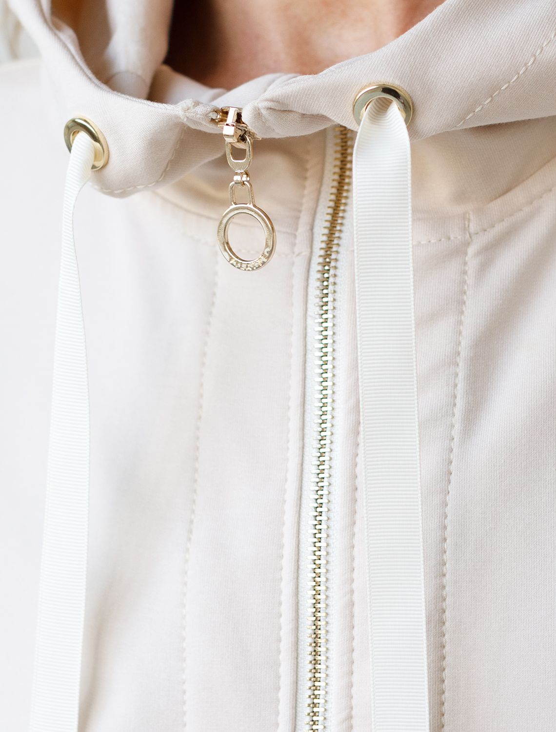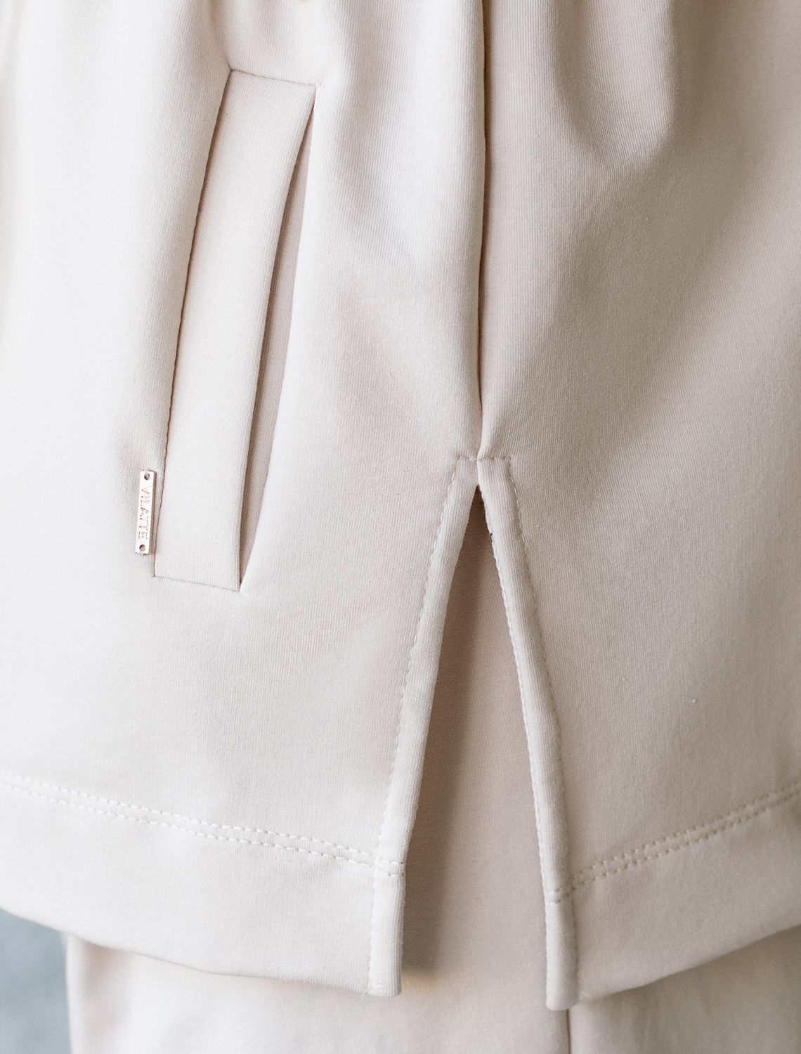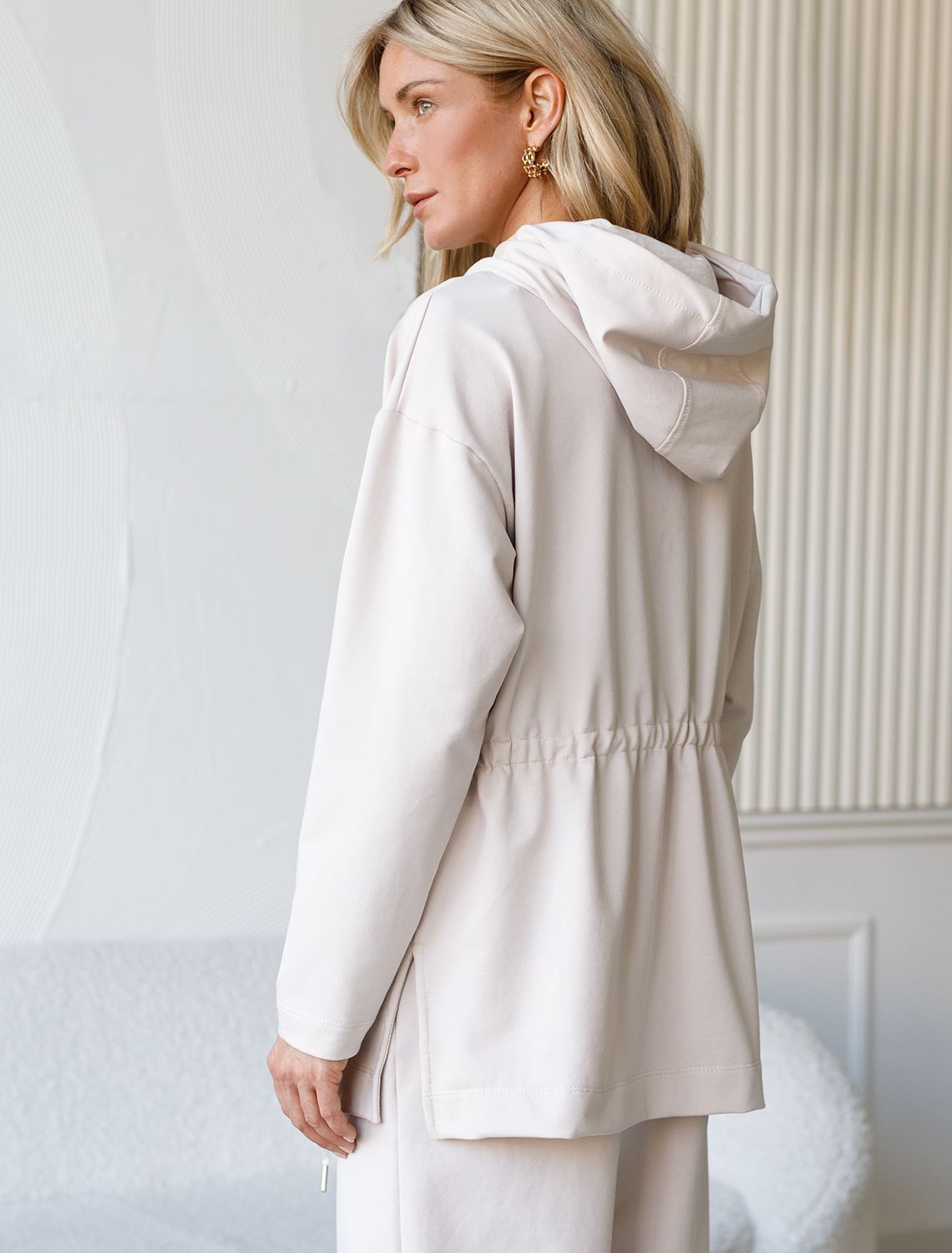 Парка выполнена из эластичного футера-двухнитки. Модель дополнена регулируемым шнуром из репсовой ленты на талии, застежкой на молнию и боковыми карманами. За счет наличия эластана, ткань хорошо держит форму, не вытягивается и гарантирует абсолютный комфорт. В теплое время года с легкостью заменит верхнюю одежду. Сочетается в костюме с брюками D44.140 и D44.14