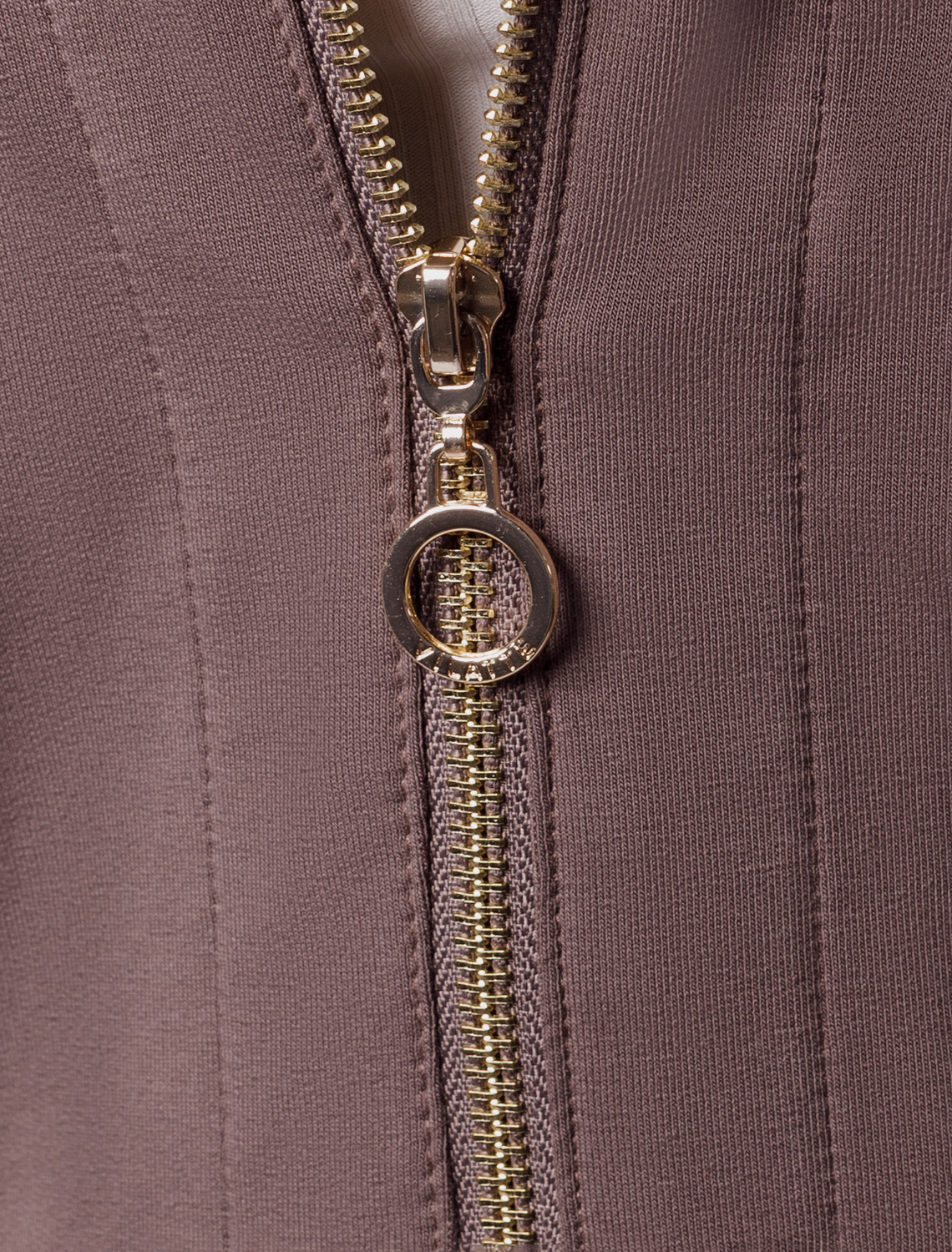 Парка выполнена из эластичного футера двухнитки. Модель дополнена золотистой фурнитурой высокого качества с логотипом бренда. Как у классической модели, изделие с капюшоном, боковыми карманами и регулируемым поясом на хлопковом шнурке. Сочетается в костюме с брюками D44.136, D44.137 и юбкой D46.034 кофейный