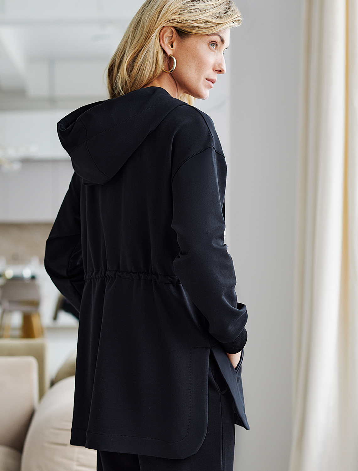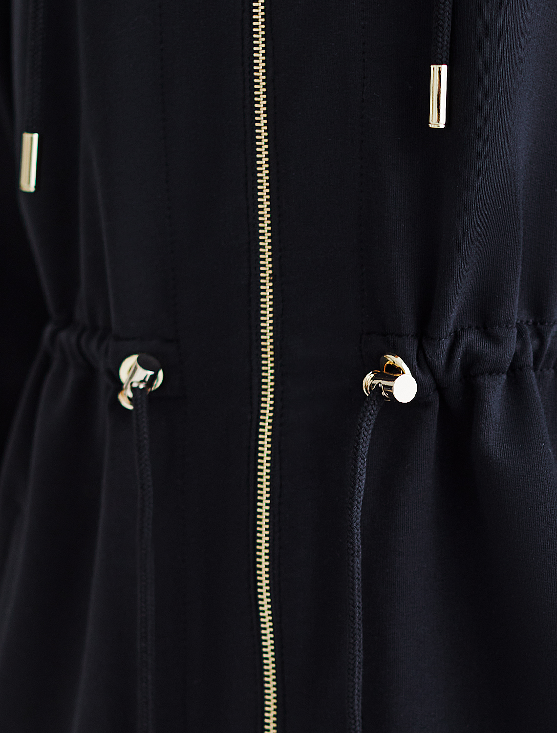 Парка выполнена из эластичного футера двухнитки. Модель дополнена золотистой фурнитурой высокого качества с логотипом бренда. Как у классической модели, изделие с капюшоном, боковыми карманами и регулируемым поясом на хлопковом шнурке. Сочетается в костюме с брюками D44.136, D44.137 и юбкой D46.034 черный