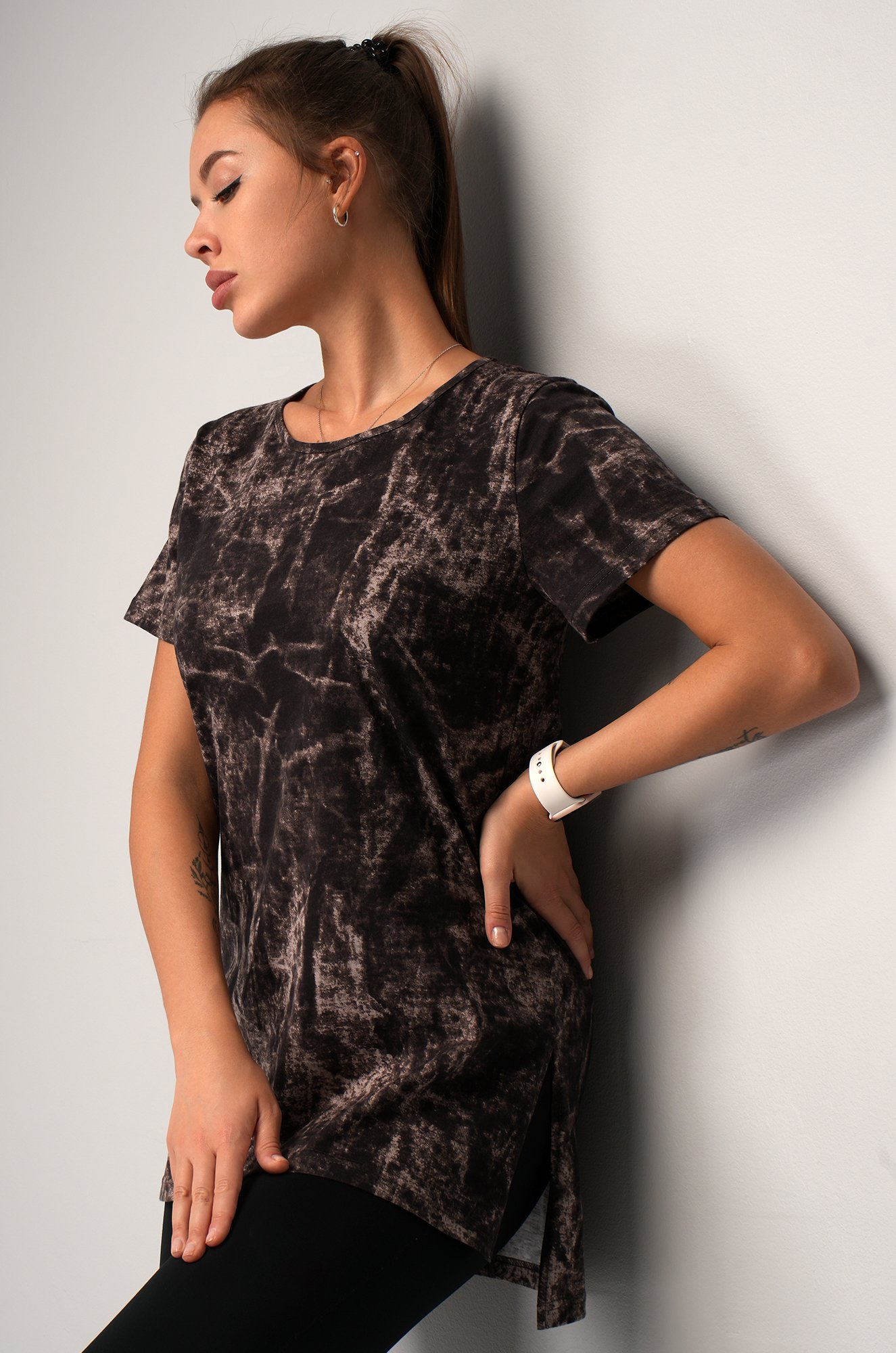Женская футболка коричневого цвета с о..показатьригинальным эффектом потертости создана, чтобы дарить уют каждый день. Длинная и слегка приталенная модель подчеркивает фигуру и дарит комфортную посадку. Хлопковая туника станет любимицей как для дома, так и для прогулок.