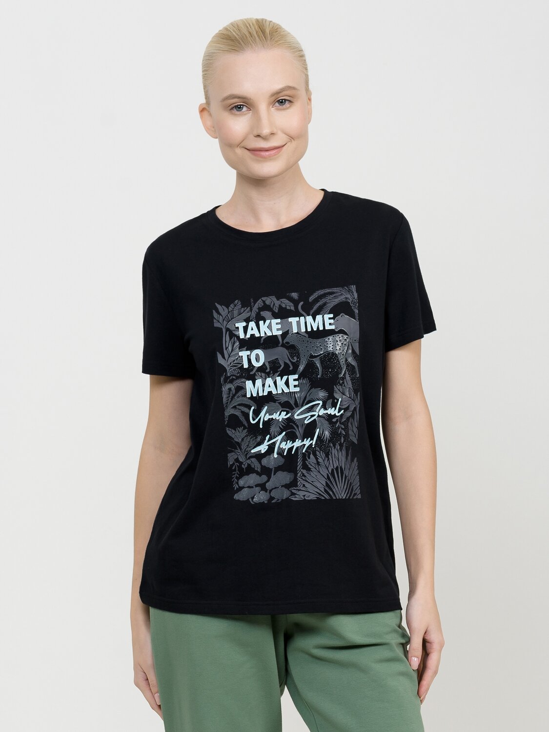Футболка маленького объема. Rubber принт с игрой матовых и глянцевых фактур. Перевод Найдите время, чтобы сделать свою душу счастливой.