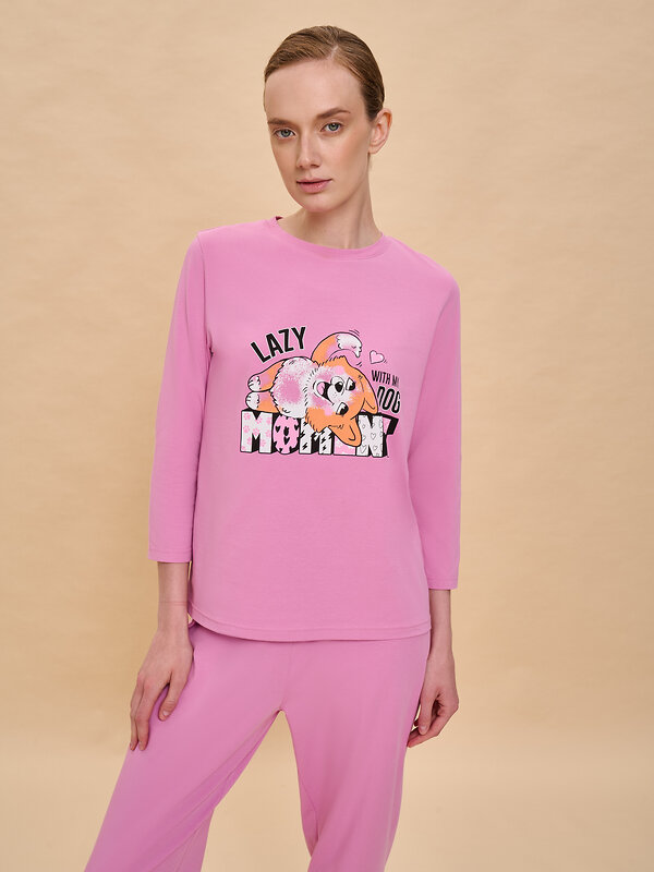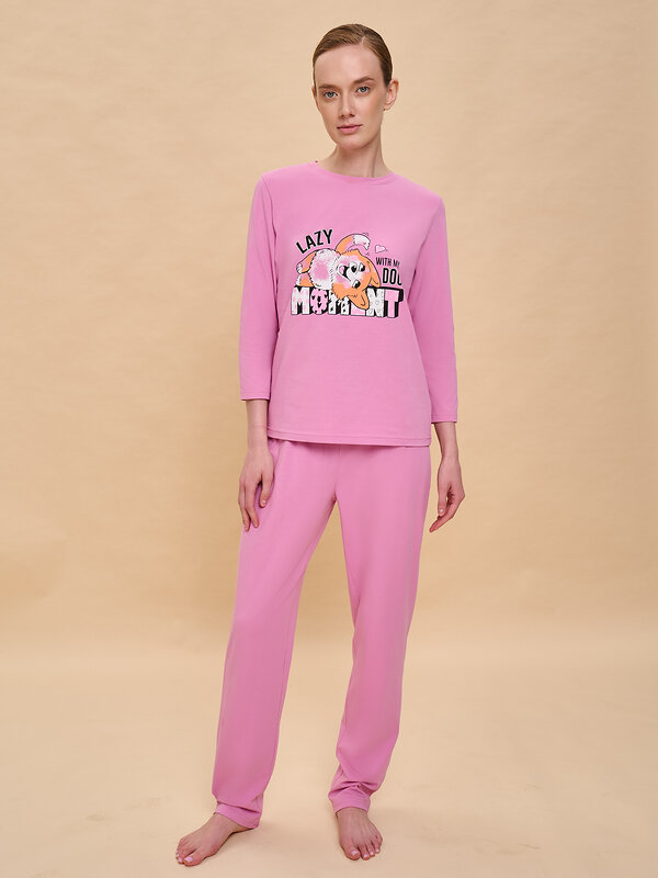 Костюм пижамный женский. В составе ткани преобладает высококачественный хлопок — комплект для сна мягкий, гипоаллергенный и воздухопроницаемый. В хлопковой пижаме вам будет тепло и уютно во время сна. Эластан помогает модели надолго сохранить первоначальную форму. Джемпер и брюки умеренного объёма, плечо немного спущено, рукава широкие и свободные — в пижаме очень удобно спать. В поясе брюк мягкая и широкая резинка — не перекручивается и не давит. Отделка горловины из эластичной рибаны — она не растягивается, пижаму удобно надевать и снимать. Хлопковая пижама украшена милым, «няшным» принтом в виде собачки корги, надпись переводится: «ленивый момент с моей собакой». Пижамный костюм неприхотлив в уходе. Принт эластичный и стойкий, хорошо переносят частые стирки. Пижама женская с брюками подходит как для сна, так и просто для отдыха дома, пижамной вечеринки. Помните о правильном уходе за изделием: рекомендуется стирать при температуре не выше 30 °C, без предварительного замачивания, с изнанки. Это поможет сохранить качество и цвет пижамы на длительное время. Не забывайте о выборе правильного размера. Используйте таблицу размеров на фотографии, чтобы выбрать подходящий для себя вариант. Обратите внимание, что цвет товара на экране вашего устройства может отличаться от реального.
