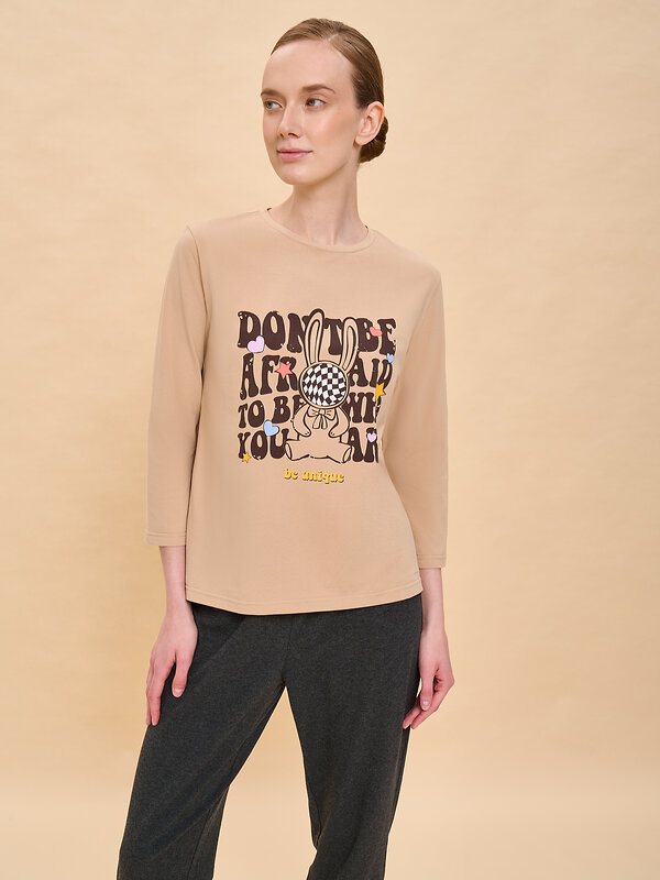 Костюм пижамный женский. В составе ткани преобладает высококачественный хлопок — комплект для сна мягкий, гипоаллергенный и хорошо пропускает воздух. В хлопковой пижаме вам будет тепло и уютно во время сна. Благодаря эластану изделие надолго сохранит первоначальную форму. Джемпер и брюки умеренного объёма, плечо немного спущено, рукава широкие и свободные — в пижаме очень удобно спать. В поясе брюк мягкая и широкая резинка — не перекручивается и не давит. Отделка горловины из эластичной рибаны — она не растягивается, пижаму удобно надевать и снимать. Манжеты брючин широкие, из основной ткани — не передавливают ногу. Хлопковая пижама украшена милым, «няшным» принтом в виде забавного зайчика с позитивным настроением, надписи переводятся: «не бойся быть тем, кто ты есть», «ты уникален». Пижамный костюм неприхотлив в уходе. Принт мягкий и прочный, хорошо переносит частые стирки. Пижама женская с брюками подходит как для сна, так и просто для отдыха дома. Помните о правильном уходе за изделием: рекомендуется стирать при температуре не выше 30 °C, без предварительного замачивания, с изнанки. Это поможет сохранить качество и цвет пижамы на длительное время. Не забывайте о выборе правильного размера. Используйте таблицу размеров на фотографии, чтобы выбрать подходящий для себя вариант. Обратите внимание, что цвет товара на экране вашего устройства может отличаться от реального.