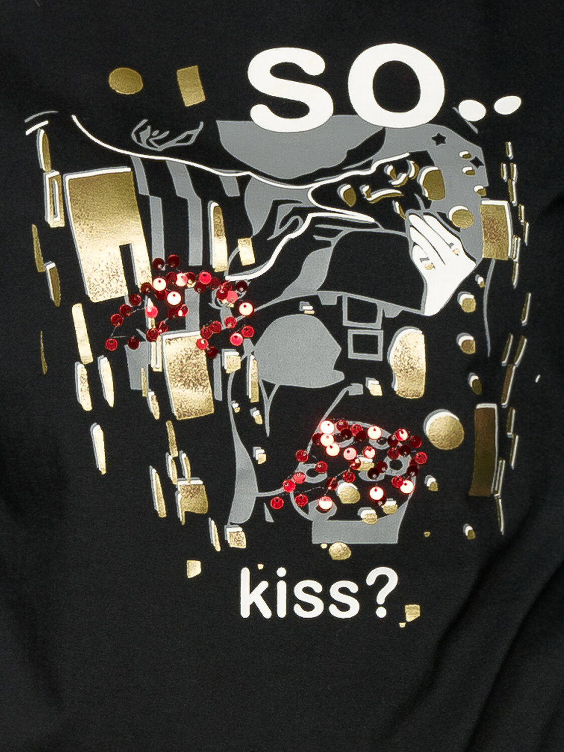 Новинка! Джемпер женский свободного объема со спущенной линией плеча, горловиной из рибаны, стойким эластичным принтом с элементами золота, в стиле картины Климта и вышивкой деликатными красными пайетками-монисто. Перевод Итак... поцелуй?