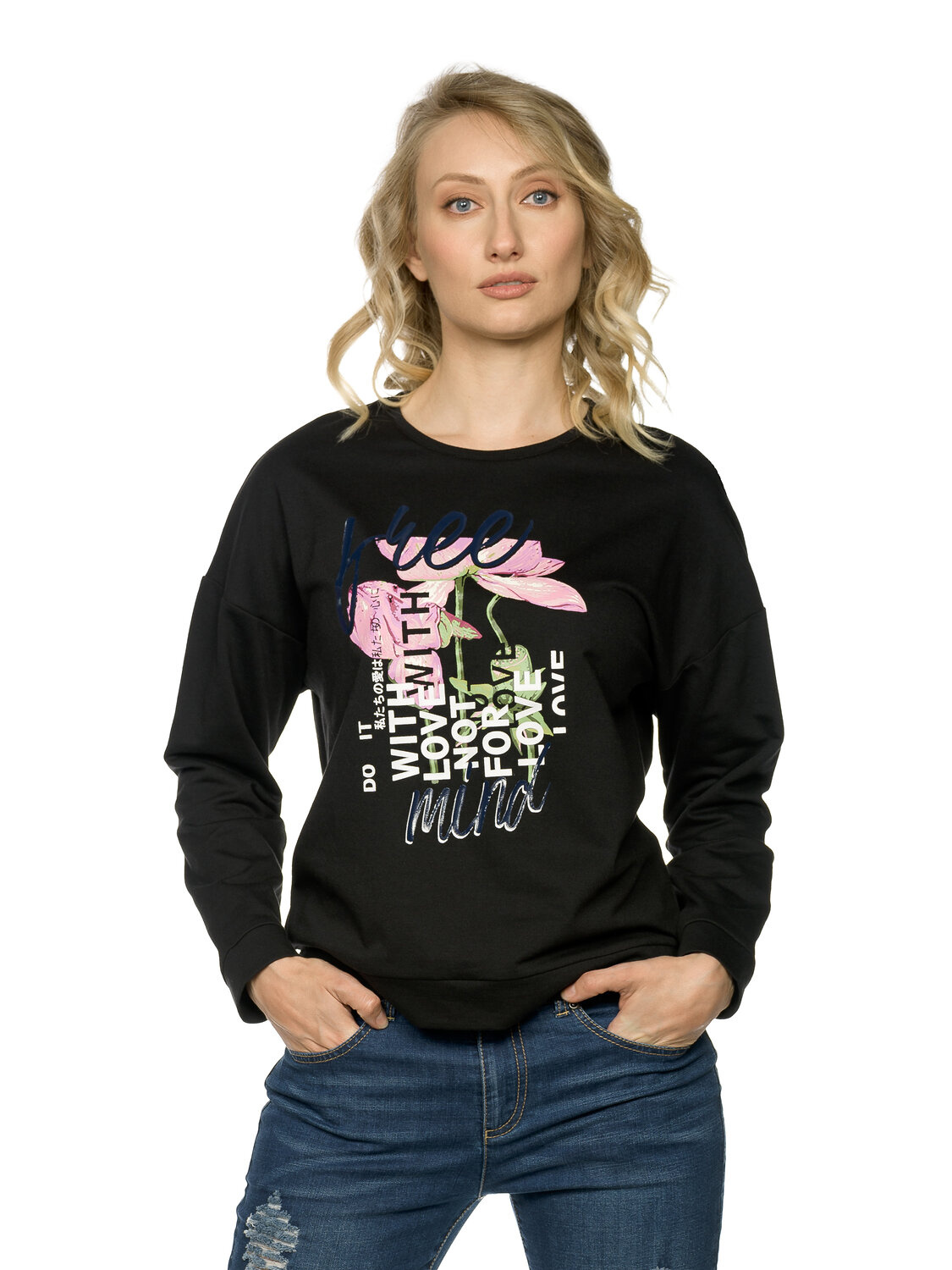 Свитшот женский среднего объема из пластичного футера со слегка спущенным плечом, комфортным объемом рукава, манжетами из основной ткани и стойким эластичным принтом с элементами глянца в шрифте. Перевод Делай это с любовью, а не ради любви. Свободный ум. Перевод с японского Наша любовь в наших сердцах.