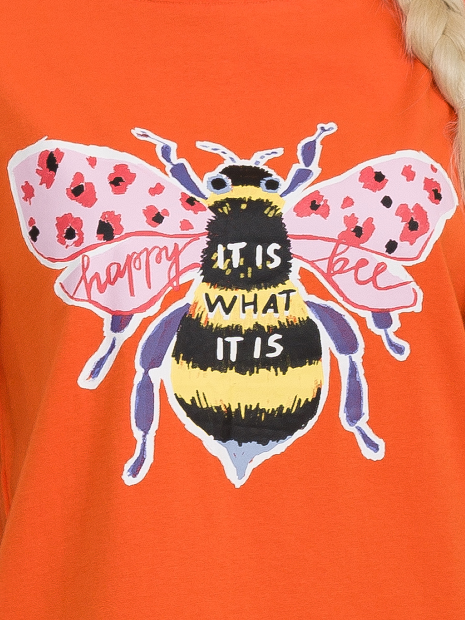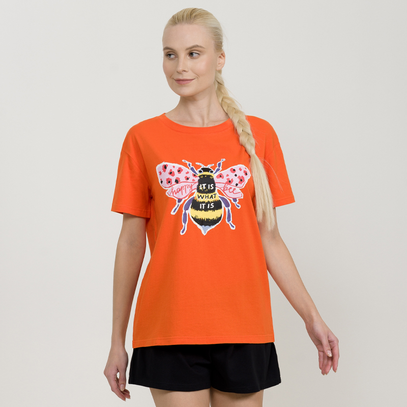 Состав: верх: 95%хлопок 5%эластан, низ: 95%хлопок 5%эластанОписание: Комплект женский футболка и шорты. Футболка прямого кроя среднего объема с эластичным rubber принтом. Перевод Счастливая пчелка ничего не поделаешь. Шорты среднего объема, по талии на широкой резинке.