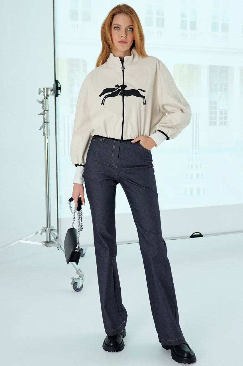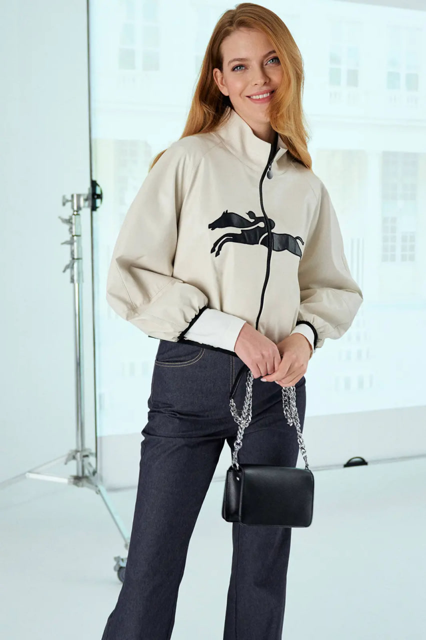 Куртка свободного силуэта из экокожи, на подкладке. Рукав реглан 3/4, объёмный с подрезом в области локтя, низ у рукава сосборен на эластичную тесьму. По горловине воротник стойка, застёжка на молнию. По переду аппликативная вышивка из экокожи, низ куртки сосборен на эластичную тесьму.