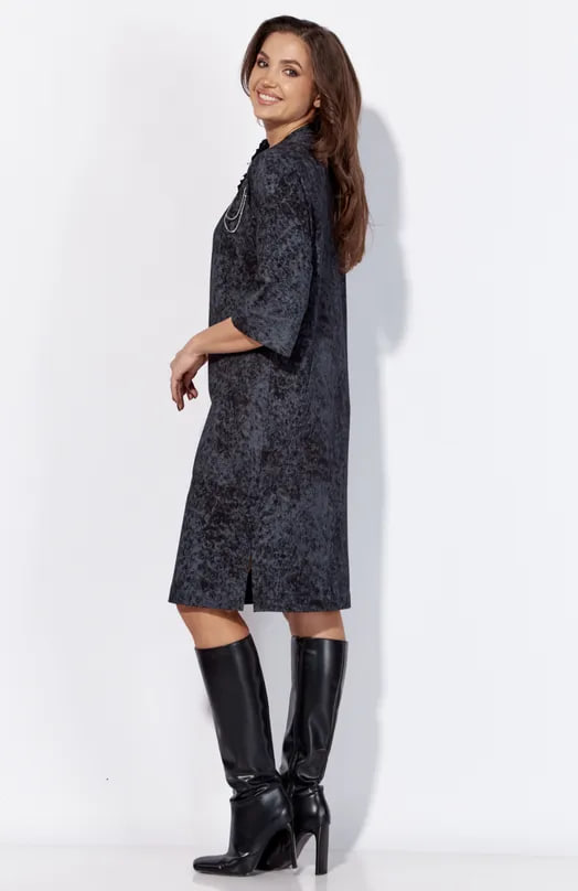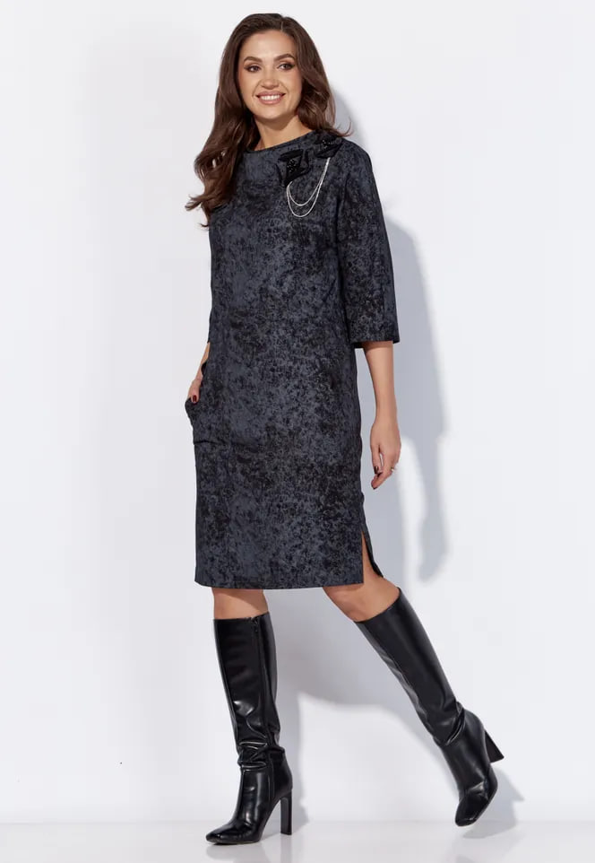 Платье женское, прямого силуэта с цельнокроеным рукавом, длинной 3/4. По переду и спинке фигурные рельефы. По переду карманы в рельефах с отделочной отстрочкой. По низу, в боковых швах, разрезы. Горловина оформлена небольшой, мягкой, цельнокроеной строчкой. Декором служит съемное украшение (цветы) с цепочкой
