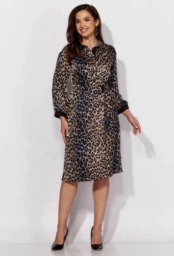 Платье женское, прямого силуэта с рукавом длинной 7/8. Рукав со спущенной линией плеча, по низу манжета с резинкой. Воротник рубашечный, на стойке. Застежка до линии талии, с отрезной планкой на петли и пуговицы. Из-под кокеток переда и спинки - сборка. По боку платья, шлица. Линию талии подчеркивает съемный пояс