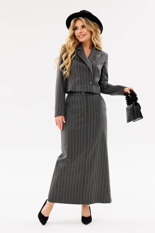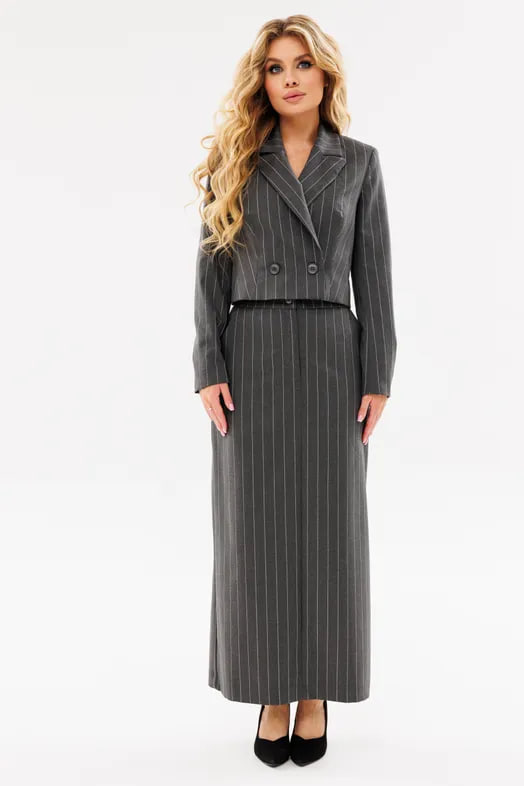 Костюм двухпредметный: состоящий из жакета и юбки. Жакет укороченный полуприлегающего силуэта. По переду нагрудная вытачка. Двубортная застёжка на петли-пуговицы. Жакет на подкладке. Юбка расклешенная к низу на притачном поясе. По переду застежка на молнию и пуговицу. По бокам действующие карманы. Юбка с разрезом сзади, на подкладке