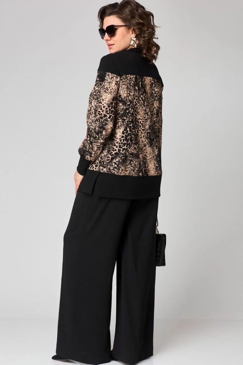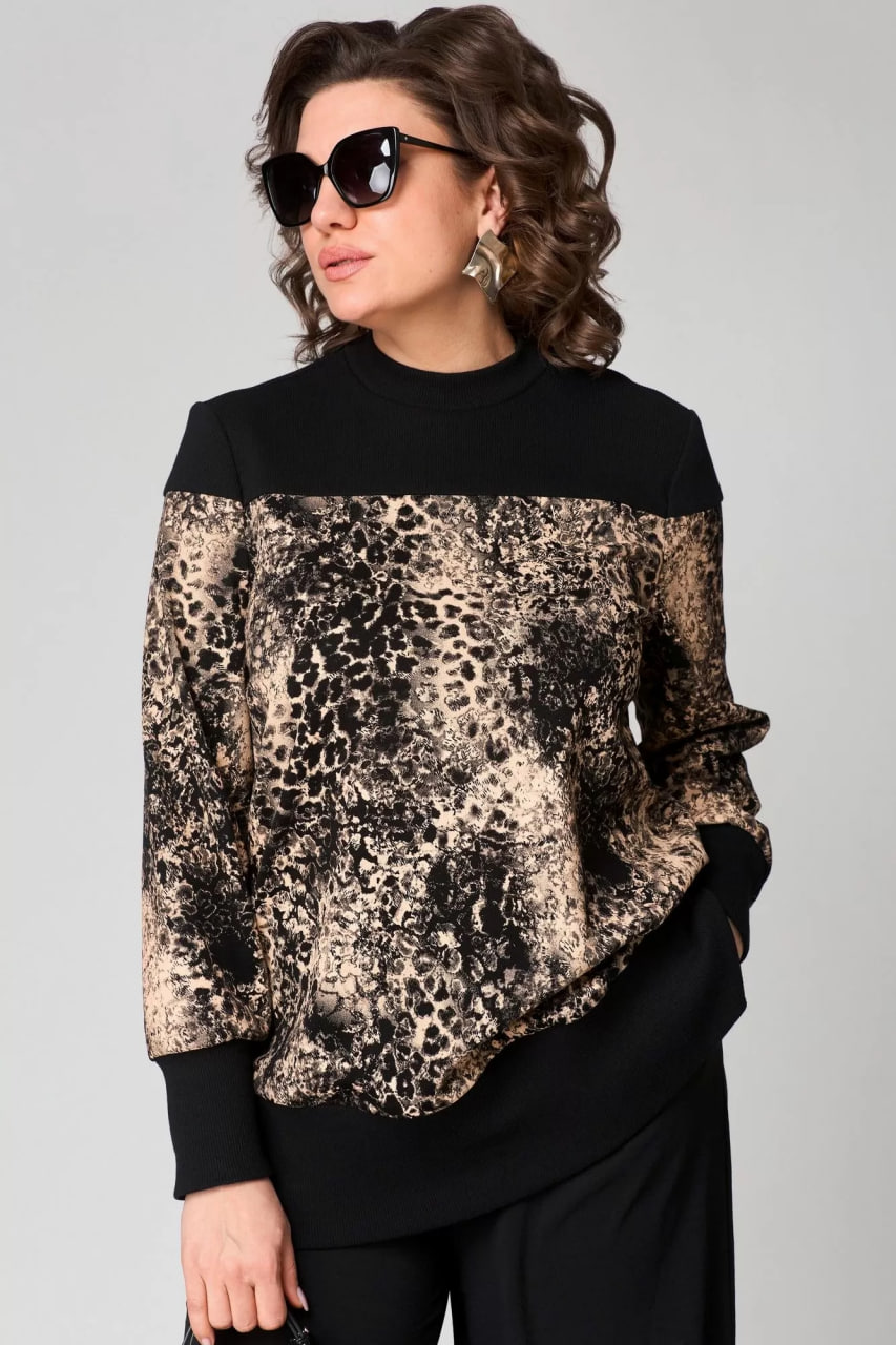 Блуза женская повседневная прямого силуэта выполнена из трикотажного полотна двух дизайнов. Вырез горловины невысокая мягкая стойка. Рукав втачной по низ на притачной манжете. В боковых швах обработаны небольшие разрезы. Декором служит дизайн основной ткани.