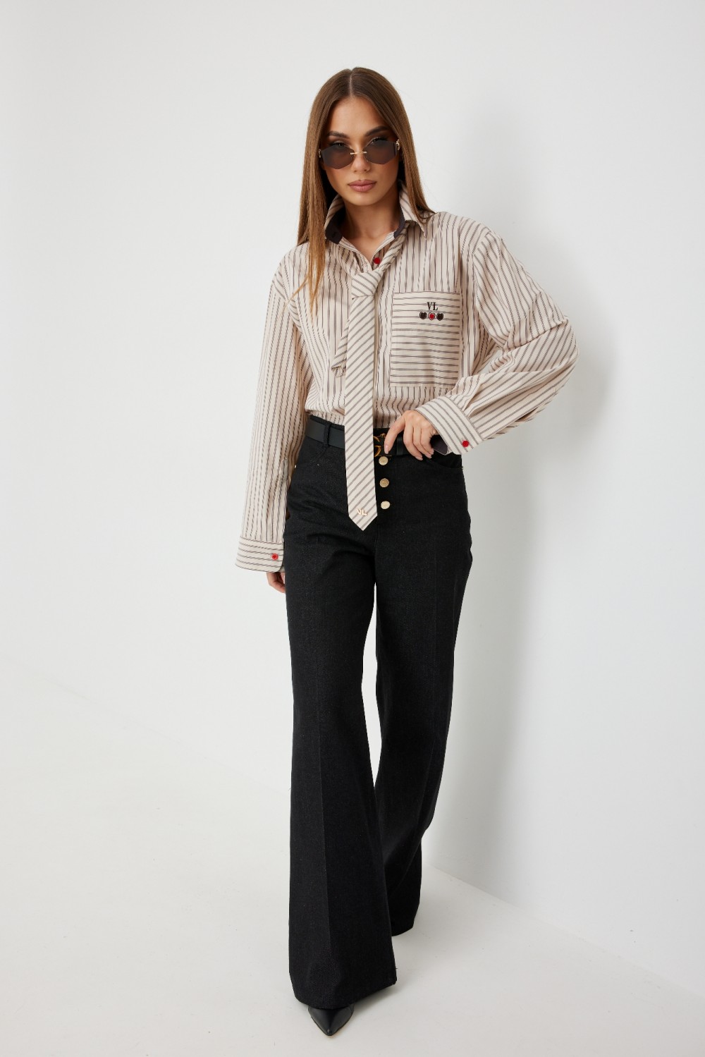 "Брюки клёш из джинсовой ткани. Верх на притачном поясе