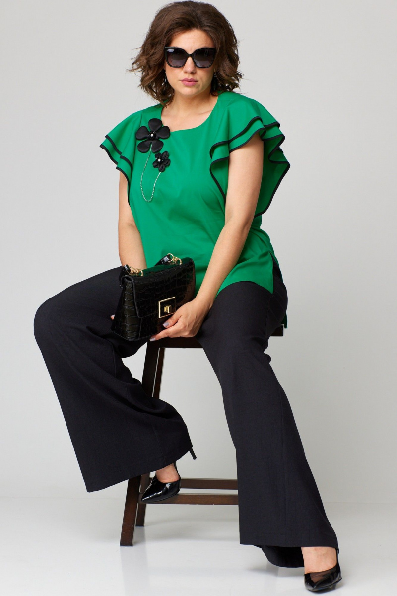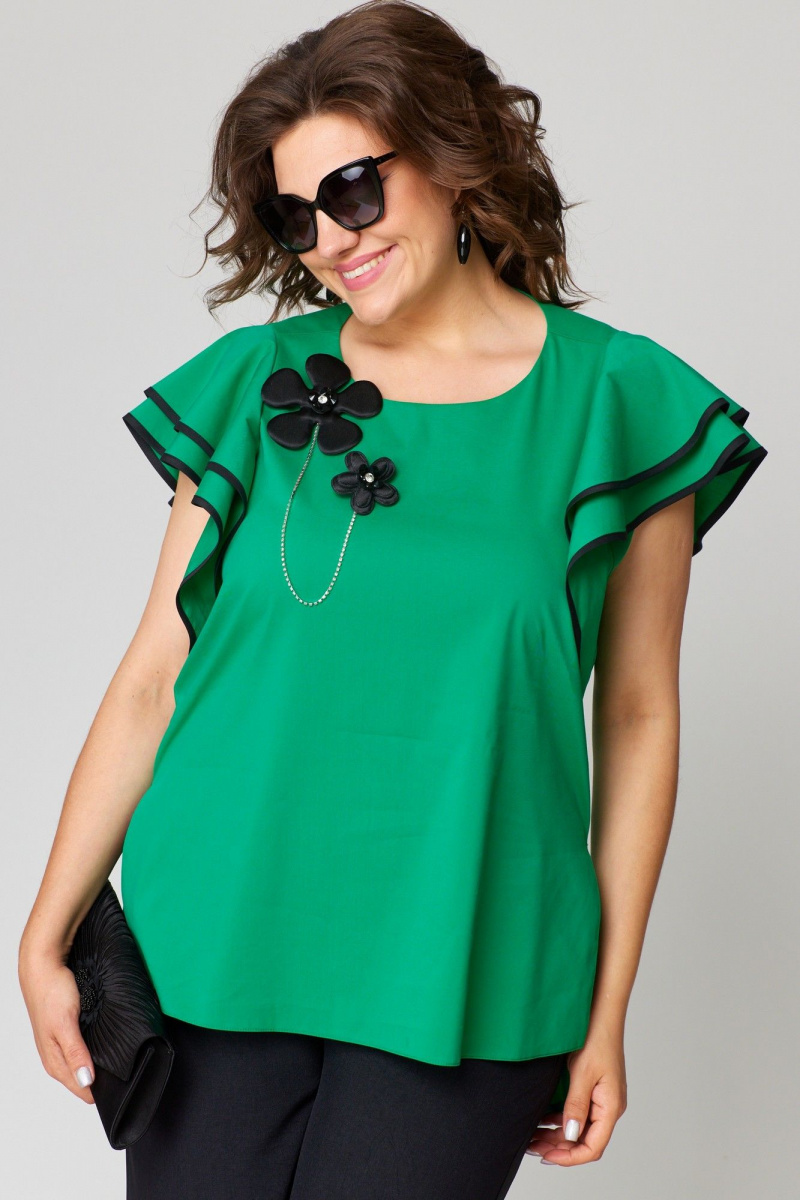 Блуза прямого силуэта с фигурным низом, выполнена из хлопка. Вырез горловины круглый на обтачке, рукава втачные двойные "крылышки". В боковых швах обработаны разрезы. Декором служит контрасная окантовка на рукавах и съемная отделочная брошь в виде двух цветов с цепочкой.