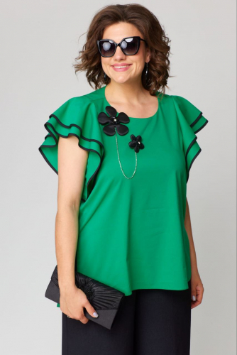 Блуза прямого силуэта с фигурным низом, выполнена из хлопка. Вырез горловины круглый на обтачке, рукава втачные двойные "крылышки". В боковых швах обработаны разрезы. Декором служит контрасная окантовка на рукавах и съемная отделочная брошь в виде двух цветов с цепочкой.