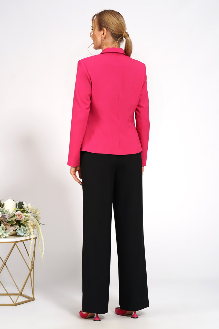 Жакет женский полуприлегающего силуэта, с ассиметричной застёжкой на пробивной люверс и пату с двумя пробивными петлями и пуговицами, с внутренней застёжкой на петлю и пуговицу.
