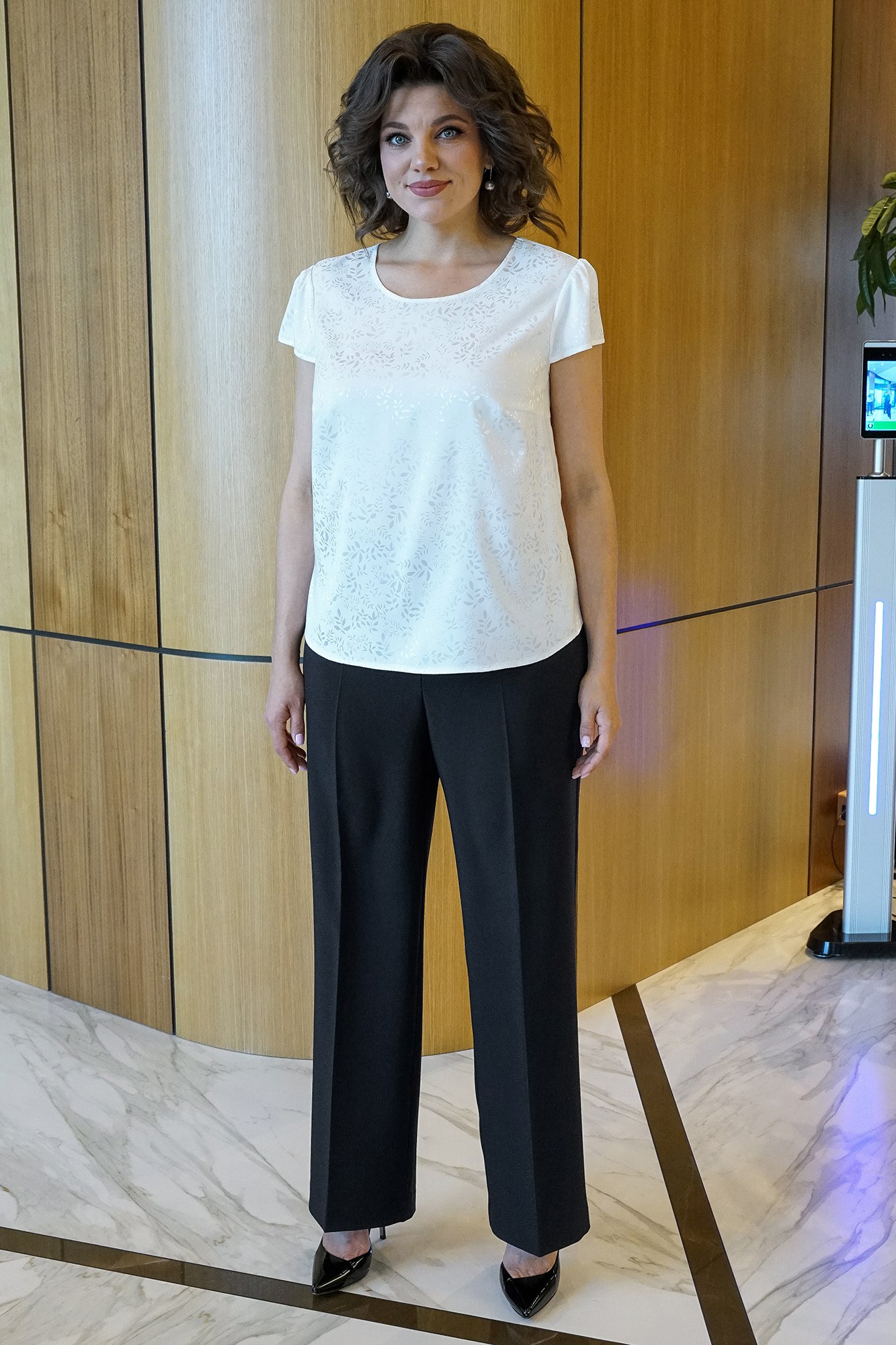 Брюки прямого силуэта, со сгибом, на притачном поясе с резинкой по боковым.