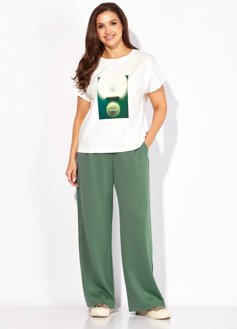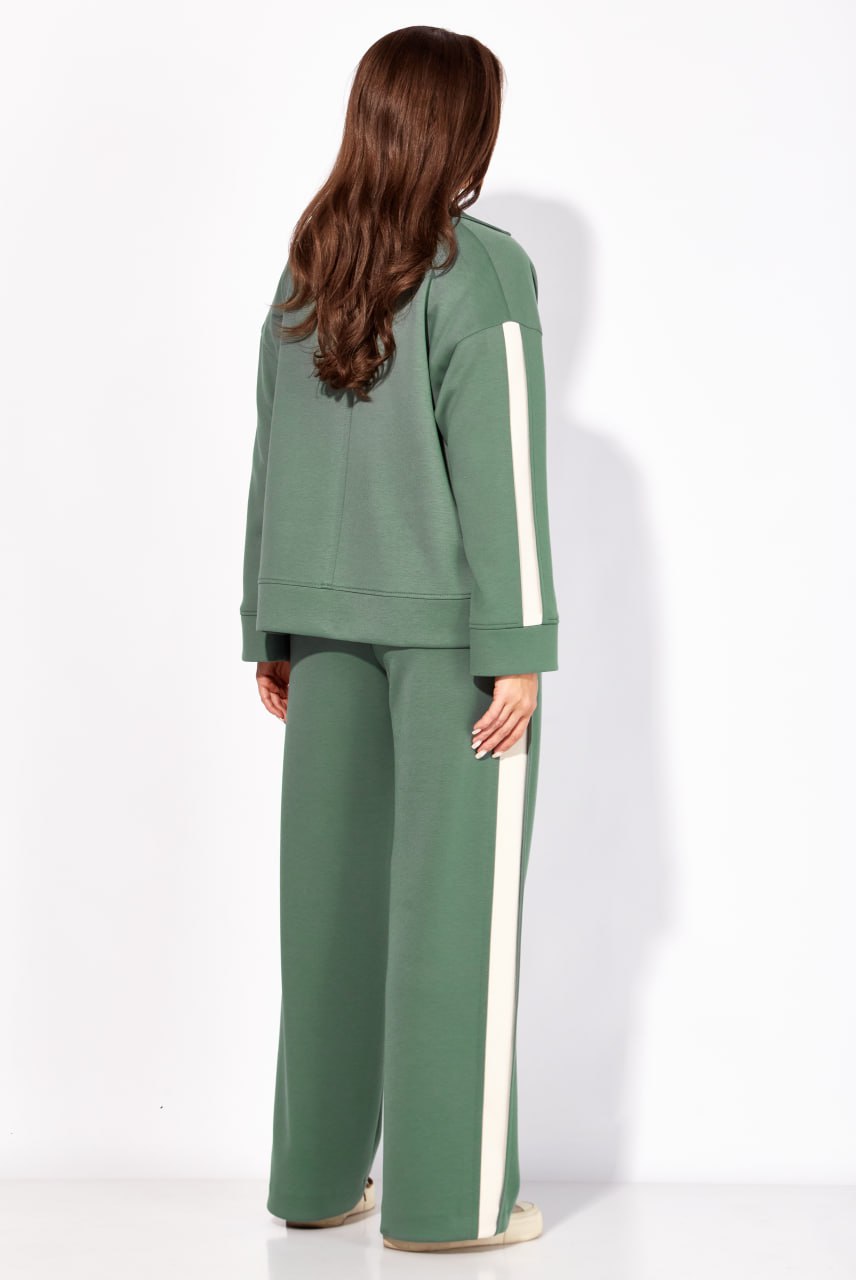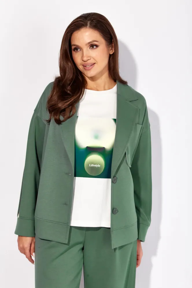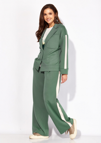 Комплект женский, 3х предметный, состоящий из жакета, топа и брюк. Жакет и брюки выполнены из трикотажного полотна "TENSEL", топ-хлопковый трикотаж (кулирка). Жакет прямого силуэта с длинным рукавом. Рукав со спущенной линией плеча, по низу манжета. По рукаву отделочный лампас со складками. Воротник отложной с лацканами. Застежка центральная на петли и пуговицы. На левой полочке накладной карман. По низу жакета отрезная планка. Спинка со средним швом. Брюки прямые, с наклонными карманами спереди и мягкими складками. По боку отделочный лампас со складками. Пояс притачной, с резинкой и гладкой центральной частью. Топ прямого силуэта, с коротким цельнокройным рукавом. Горловина круглая, с отрезной планкой. По переду топа яркий принт