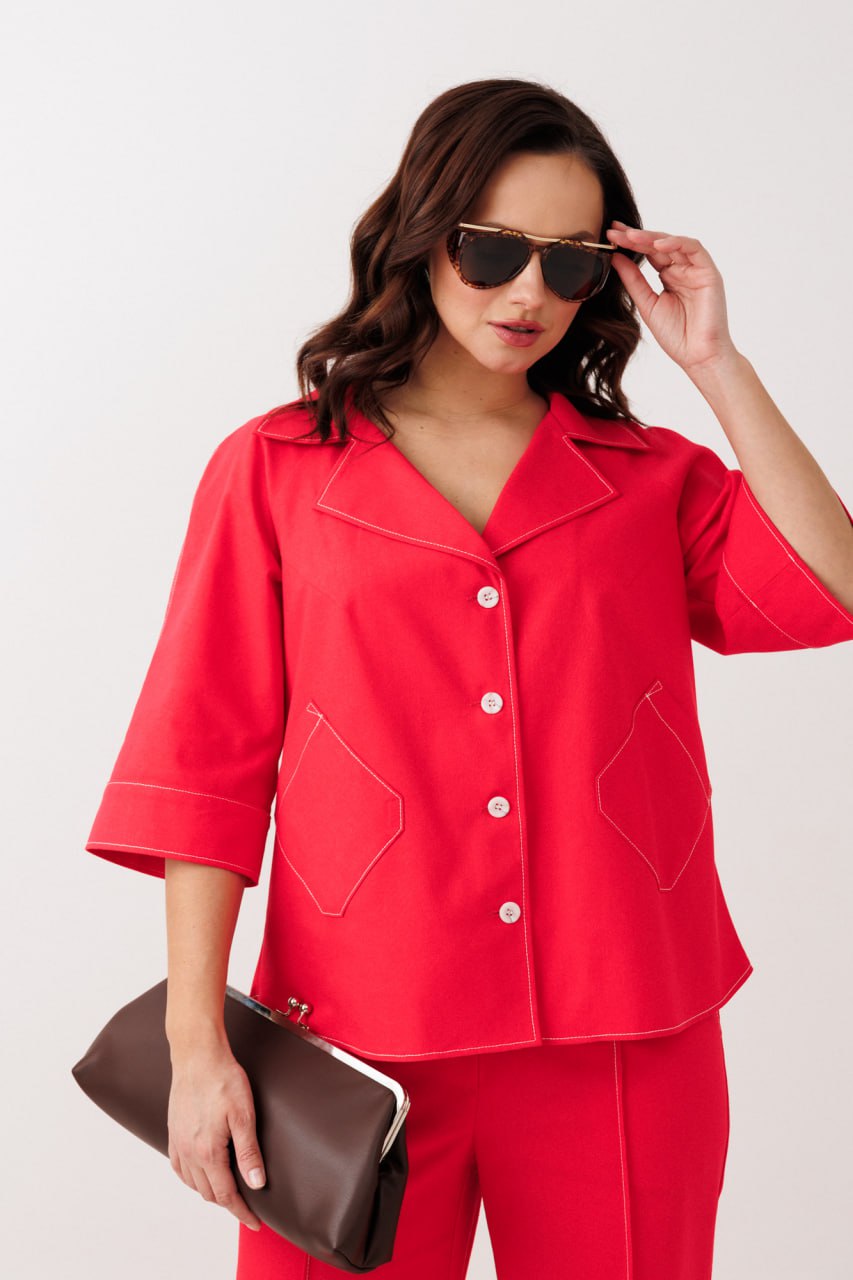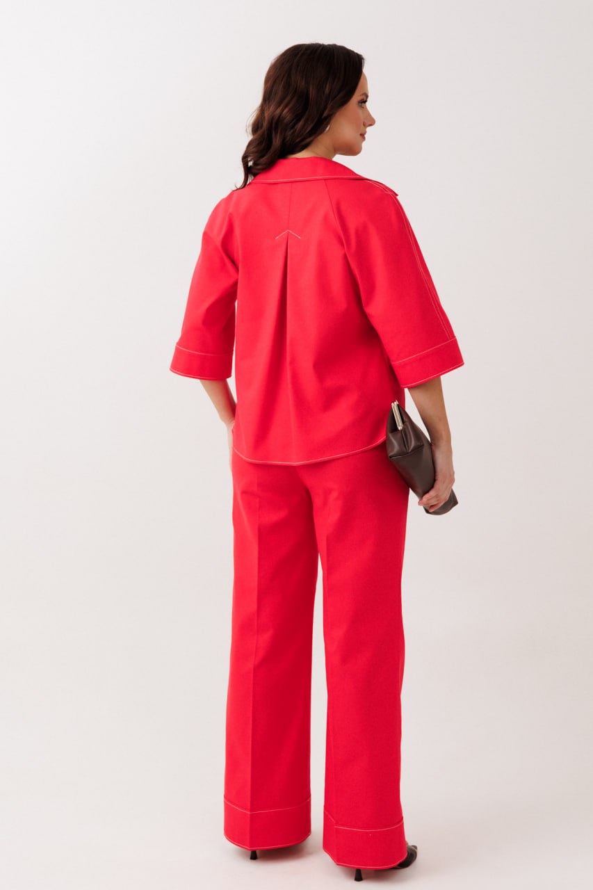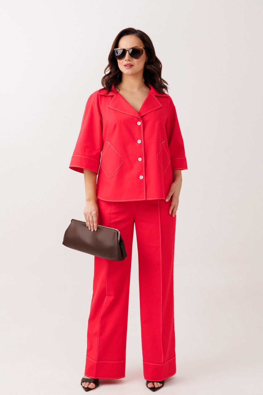 Изготовленный из 100% льна, костюм обладает небольшим эффектом стрейч, что обеспечивает свободную посадку и комфорт в течение всего дня. Жакет прямого силуэта украшен контрастными отделочными строчками и накладными карманами, подчёркивающими его уникальный дизайн. Особенности фасона включают центральную застежку на петли-пуговицы и воротник пиджачного типа с лацканом. Брюки с высокой посадкой и свободным кроем имеют наклонные карманы и застёжку-молнию по срезу банта. Костюм выполнен в стильном синем цвете, идеально подходящем для повседневного или офисного стиля. Отрезные манжеты на брюках и реглан-рукава с манжетами делают костюм подходящим для весенне-летнего сезона.