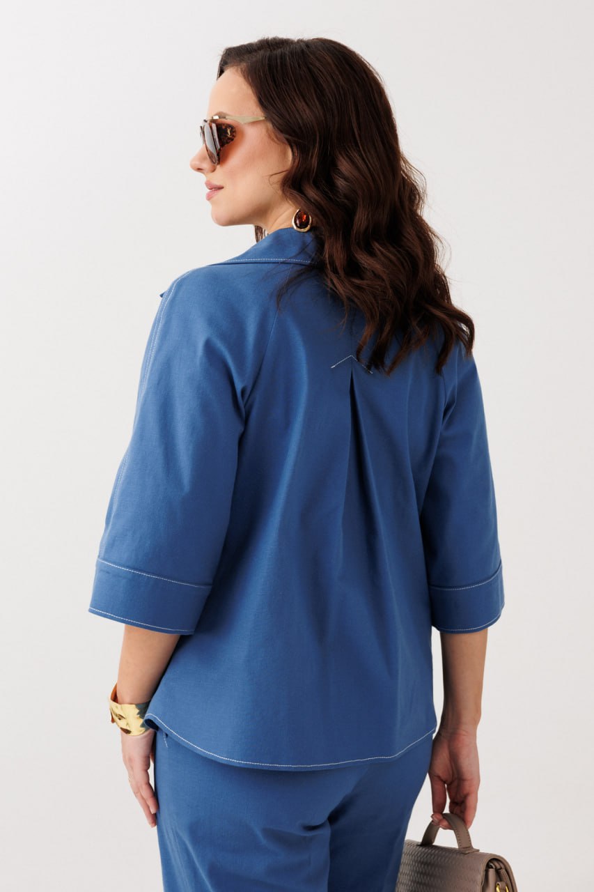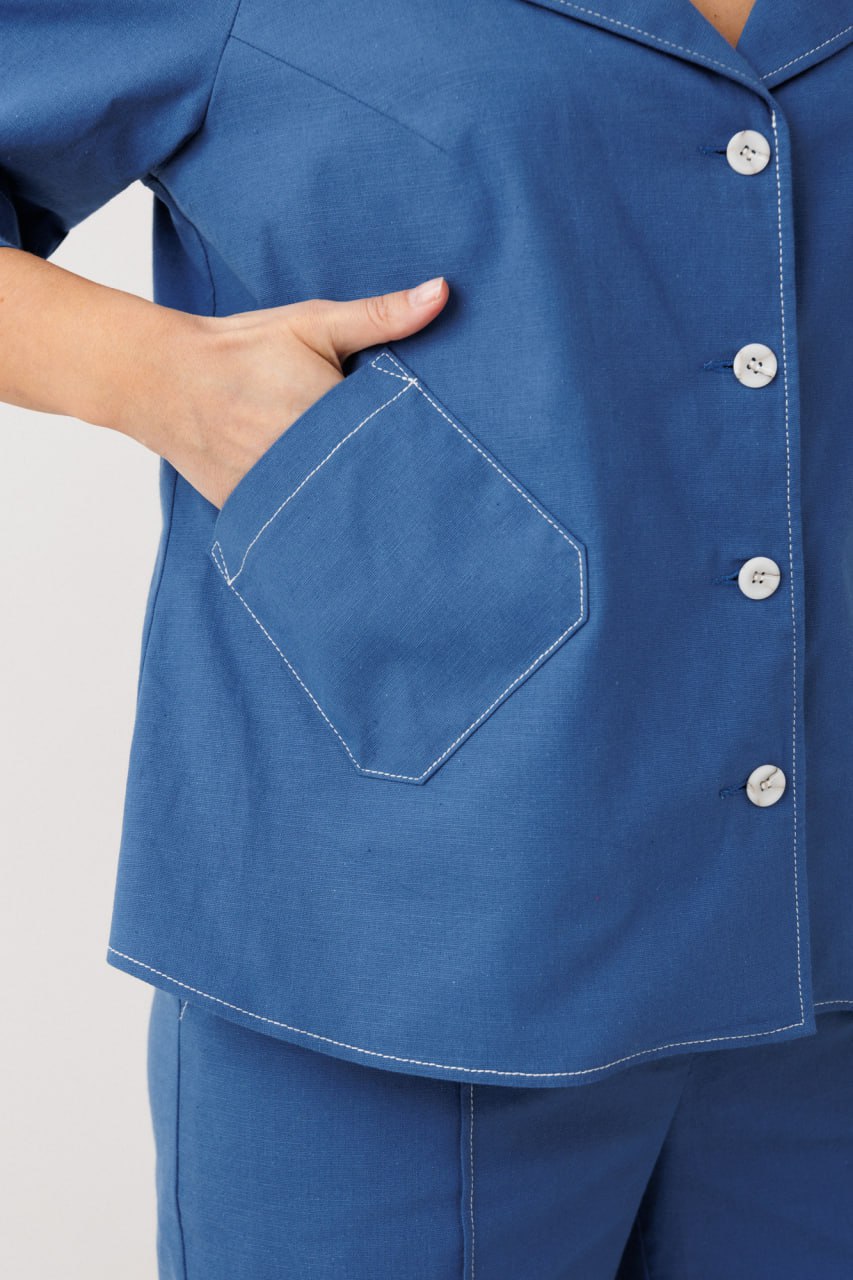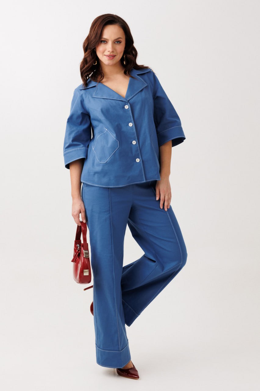 Изготовленный из 100% льна, костюм обладает небольшим эффектом стрейч, что обеспечивает свободную посадку и комфорт в течение всего дня. Жакет прямого силуэта украшен контрастными отделочными строчками и накладными карманами, подчёркивающими его уникальный дизайн. Особенности фасона включают центральную застежку на петли-пуговицы и воротник пиджачного типа с лацканом. Брюки с высокой посадкой и свободным кроем имеют наклонные карманы и застёжку-молнию по срезу банта. Костюм выполнен в стильном синем цвете, идеально подходящем для повседневного или офисного стиля. Отрезные манжеты на брюках и реглан-рукава с манжетами делают костюм подходящим для весенне-летнего сезона.