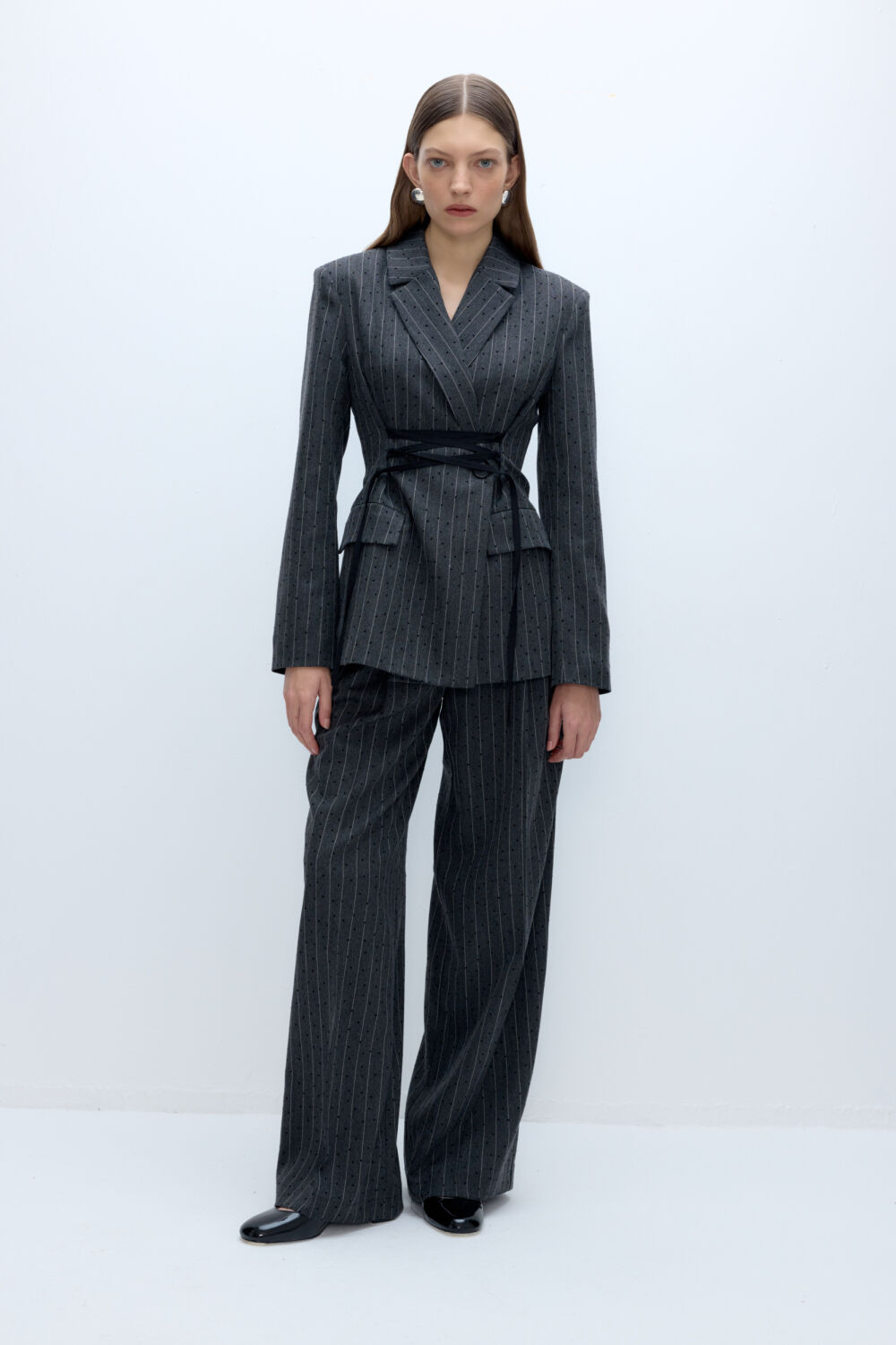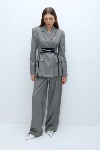 Костюм-двойка из жакета с контрастной шнуровкой и широких брюк палаццо.