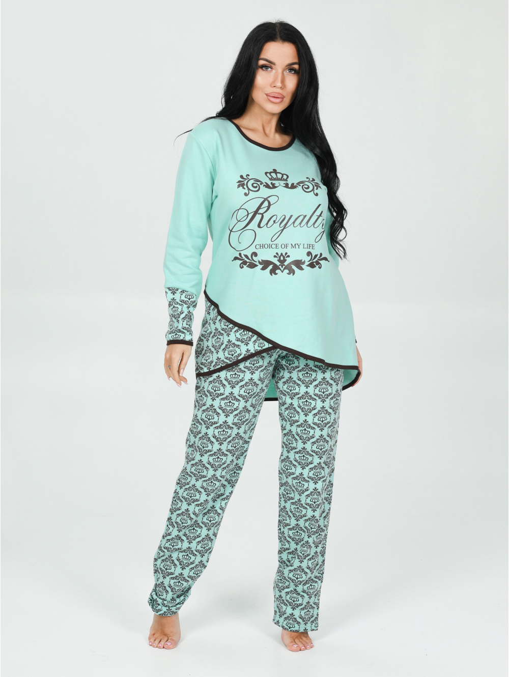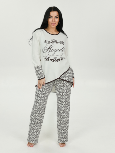 Горловина, низ кофты и рукавов обработаны окантовкой. Вставка на полочке и манжеты выполнены из набивной ткани. На полочке оригинальный принт. Модель согреет Вас теплом, позволит сбросить накопленное напряжение за целый день и хорошо уснуть. Мы уверены, что этот комплект подарит Вам истинное наслаждение при каждодневном использовании. Данная модель имеет размерный ряд до 70 размера.