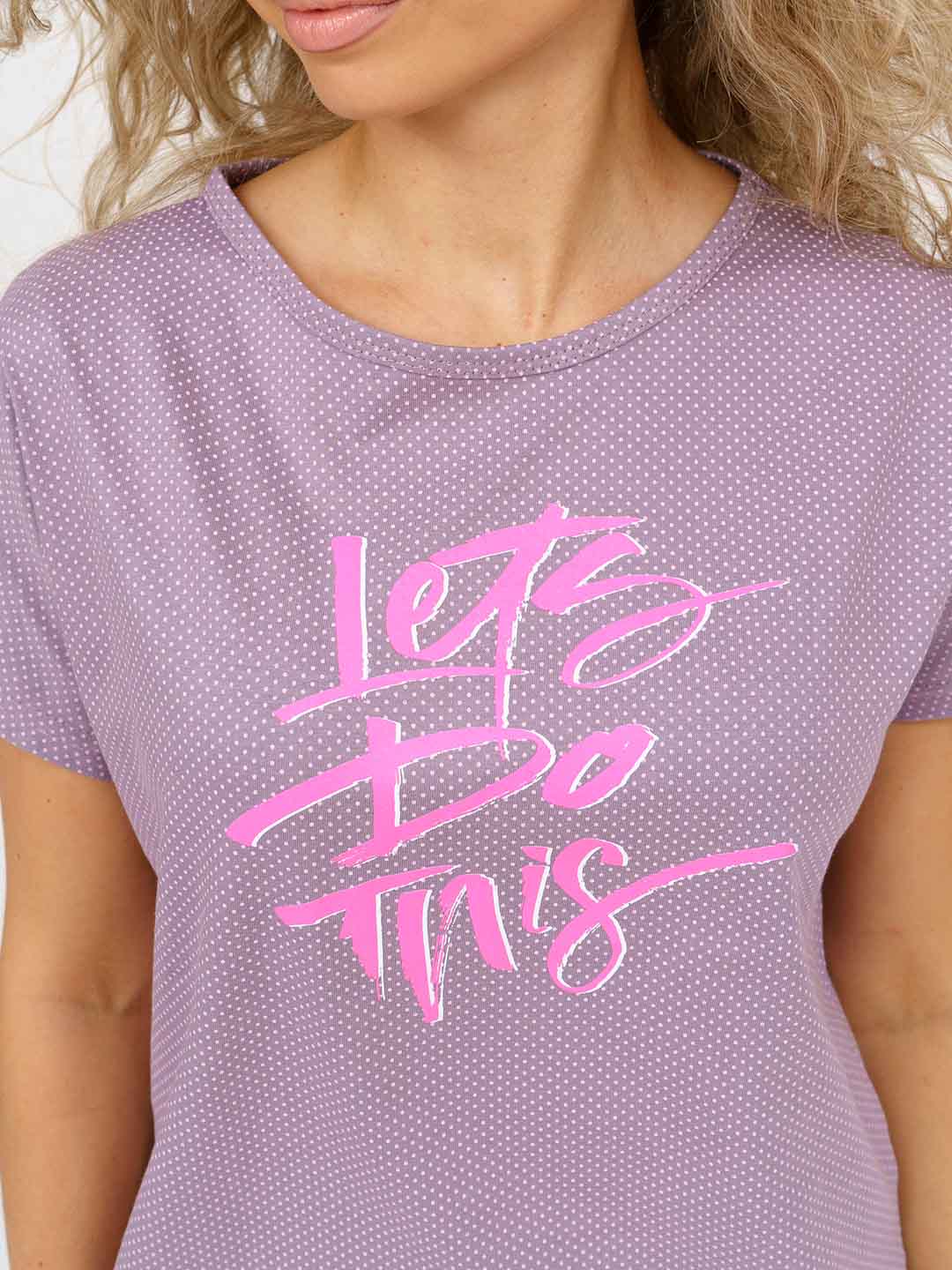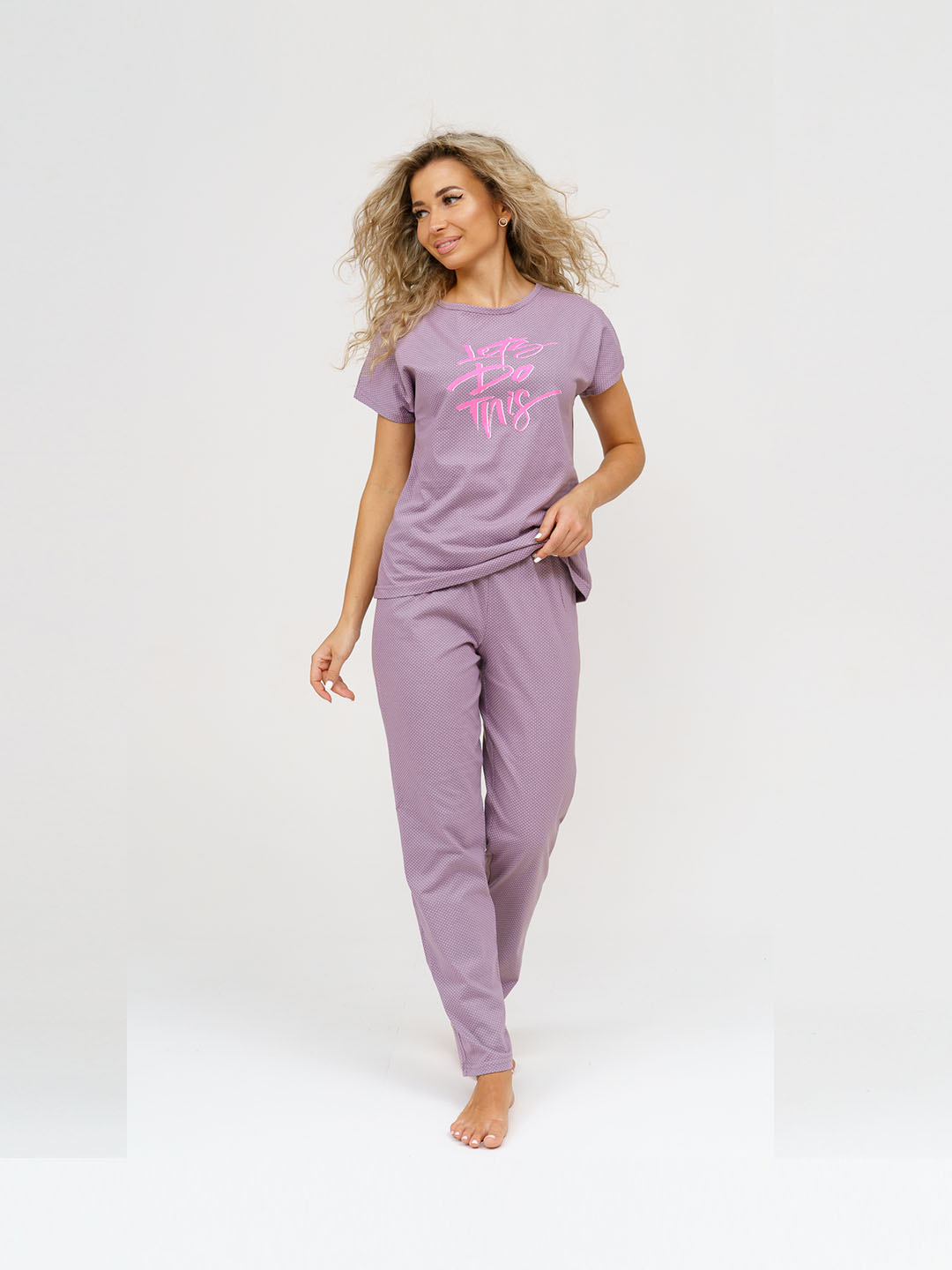Женская пижама со штанами выполнена из мягкого и качественного 100% хлопка. Ткань гиппоаллергенна и поэтому идеально подходит, не вызывает аллергических реакций и раздражений нежной кожи. Пижама женская имеет следующий комплект: футболка свободного кроя с яркой печатью и пижамные брюки на мягкой резинке. Пижама женская со штанами удобная и практичная одежда для дома, идеально подойдет для сна, пижамной вечеринки и повседневной носки по дому.