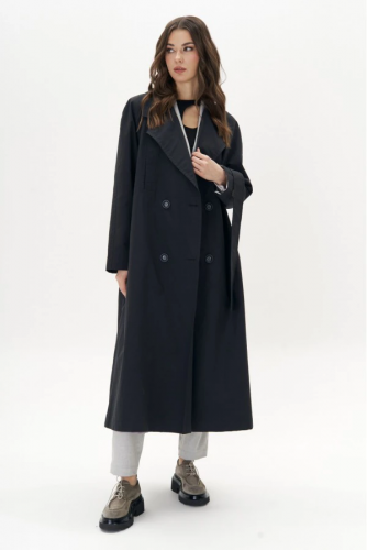 Тренчкот не выходит из моды с тех пор, как Коко Шанель представила этот вид одежды в женской, ведь до этого тренч являлся исключительно мужской одеждой. Сегодня этот вид плаща можно смело назвать базовым, его актуальность переходит из сезона в сезон.Классический вариант тренча покроя реглан в удлинённом варианте с поясом, отложным расширенным пиджачным воротником, встречной складкой по спинке, подрезом по переду и двубортной застёжкой.Полочки с боковыми карманами в рельефе и прорезными листочками в верхней части. Все фигурные линии отделочных деталей подчёркнуты широкими отделочными строчками.В качестве фурнитуры выбраны стильные пуговицы. Плащ на отлетной по линии низа подкладке.Длина изделия по спинке около 120 см. Длина рукава с плечом около 75 см. черный
