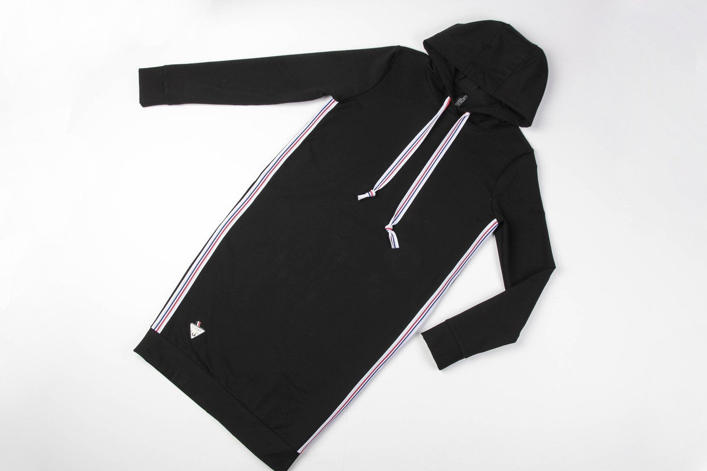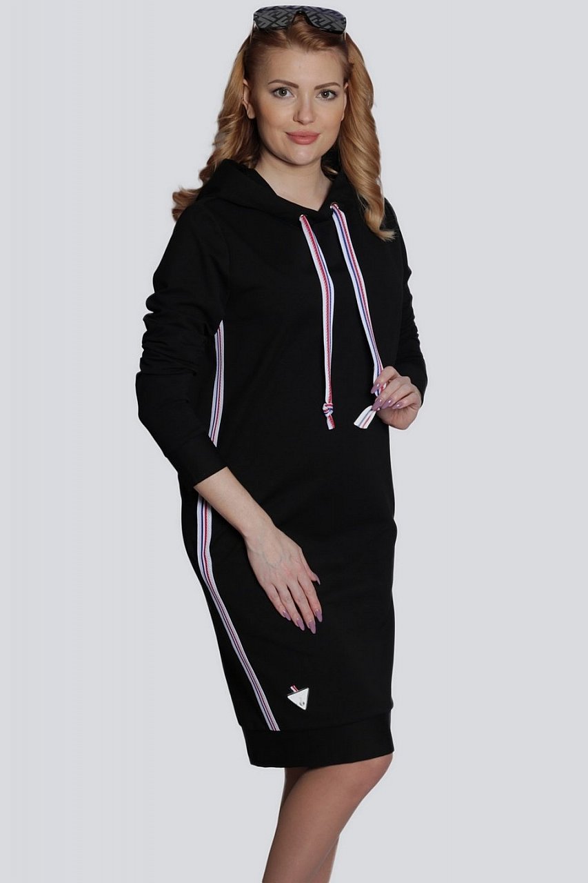 Стильное спортивное женское платье из трикотажа, как нельзя лучше подходит для повседневной носки, не сковывает движений. Платье с капюшоном имеет свободный силуэт и модную длину. В боковых швах модели спрятаны карманы. Бока декорированы лампасами. Изделие выполнено из качественного трикотажа \"двунитка\", приятного к телу и практичного в эксплуатации. Состав трикотажа: 75% хлопок, 20% полиэстер, 5% спандекс. черный