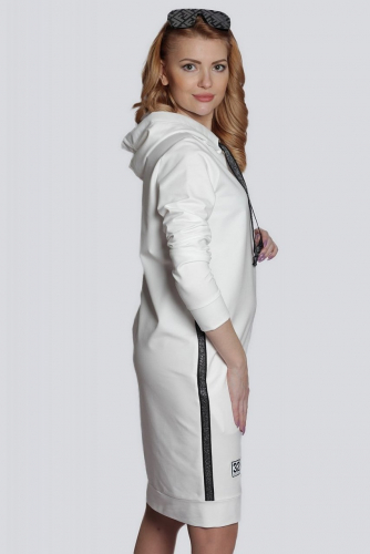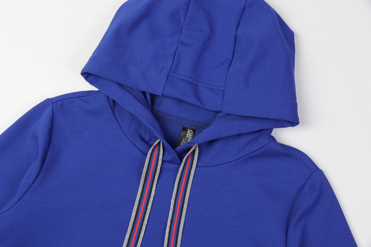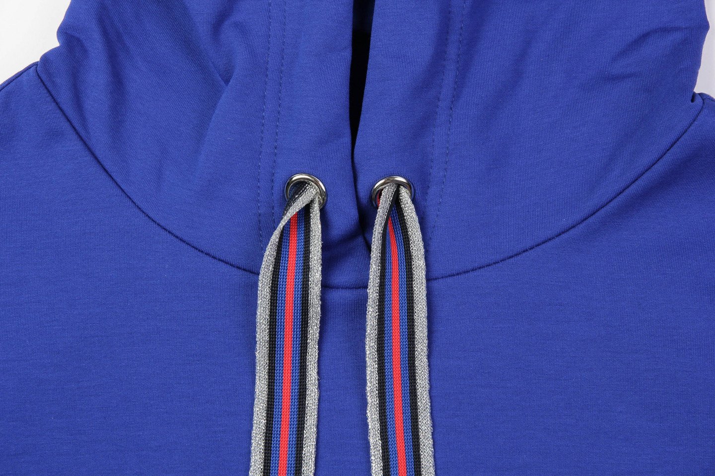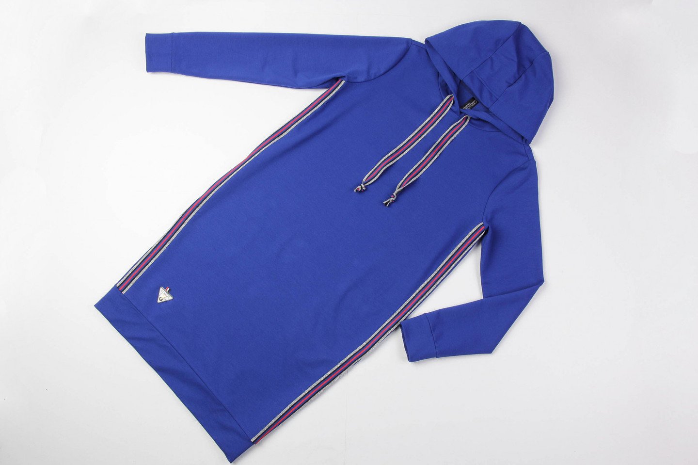 Стильное спортивное женское платье из трикотажа, как нельзя лучше подходит для повседневной носки, не сковывает движений. Платье с капюшоном имеет свободный силуэт и модную длину. В боковых швах модели спрятаны карманы. Бока декорированы лампасами. Изделие выполнено из качественного трикотажа \"двунитка\", приятного к телу и практичного в эксплуатации. Состав трикотажа: 75% хлопок, 20% полиэстер, 5% спандекс. ярко-синий