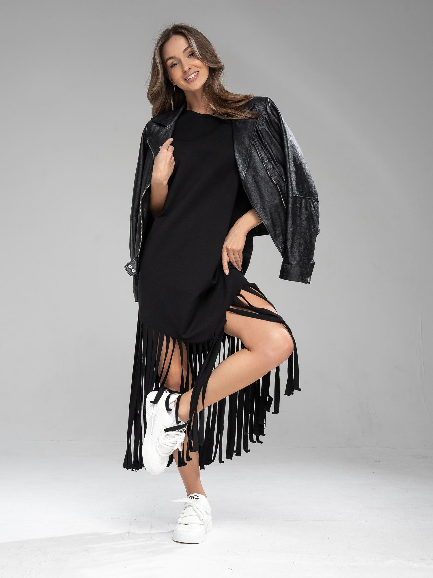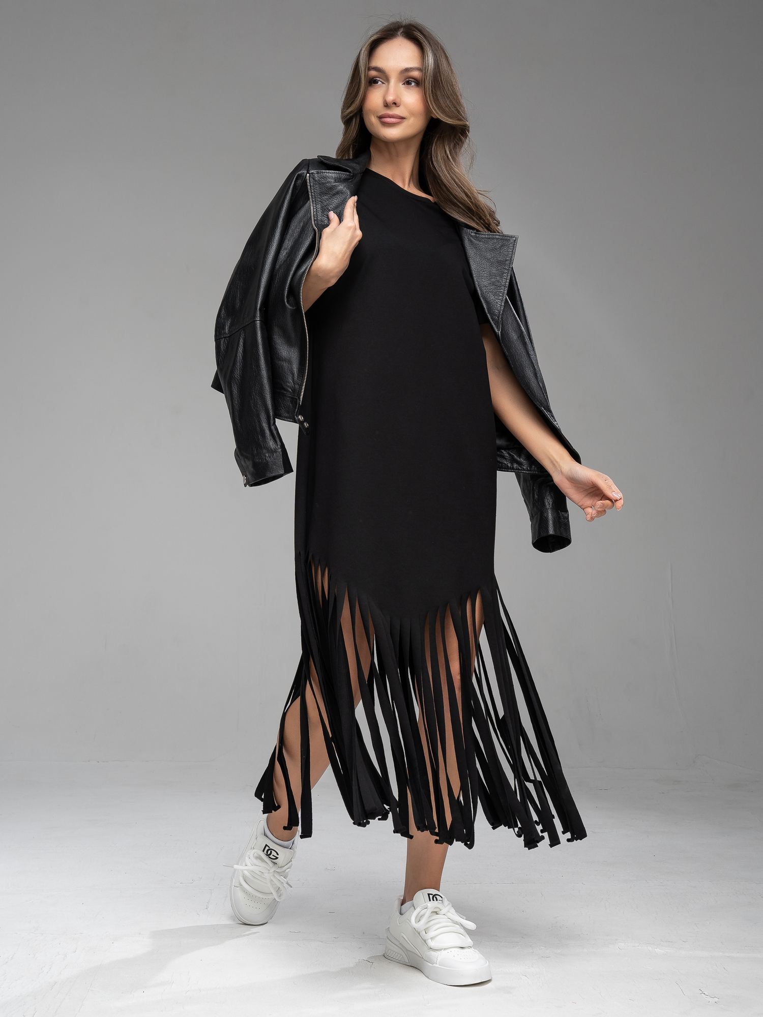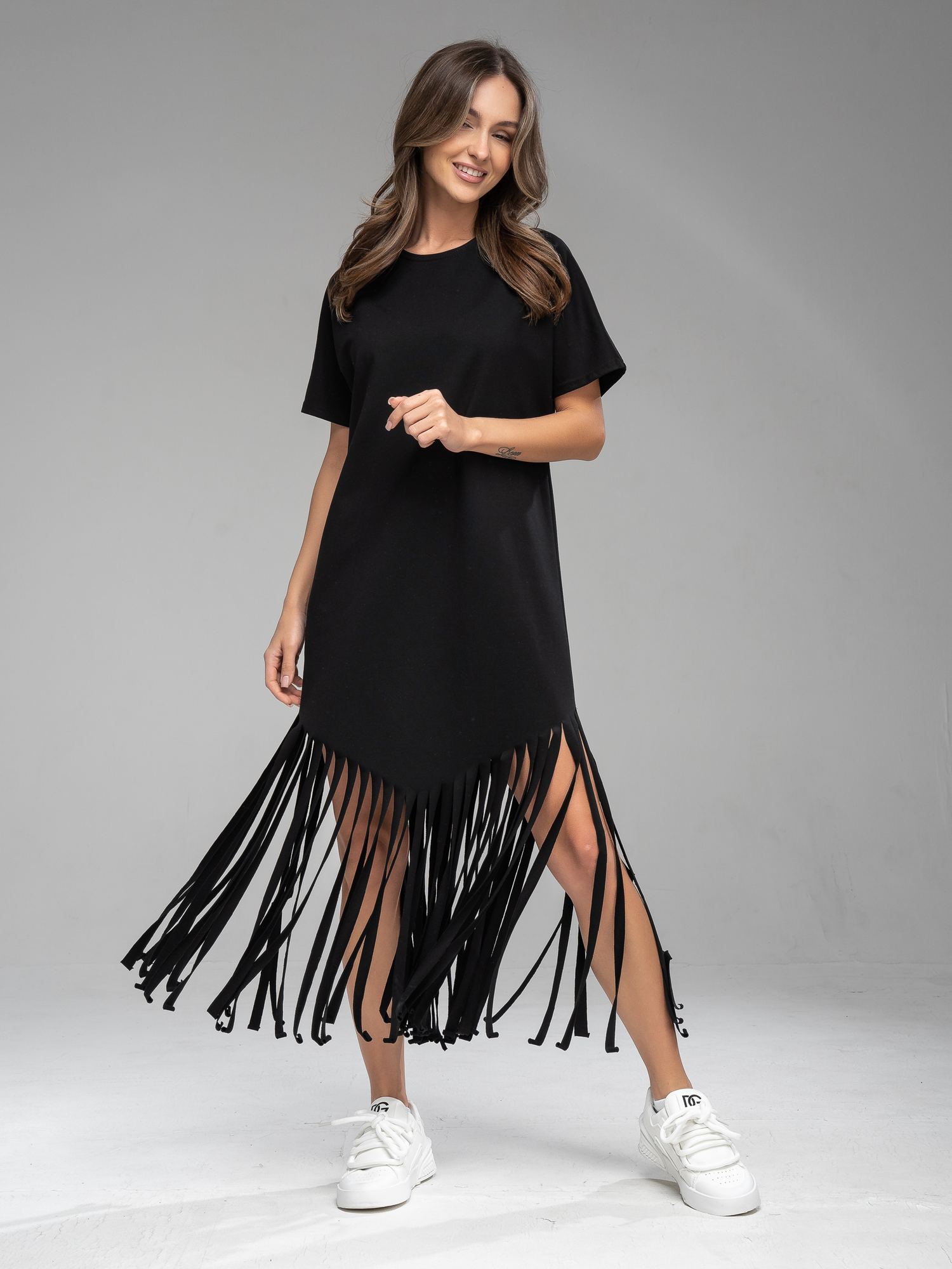 Платье-туника из футера черного цвета . Cвободного силуэта с короткими цельнокроенными рукавами. Бахрома Изделие выполнено из трикотажа премиального качества - ПЕНЬЕ, с содержанием хлопка более 92%
