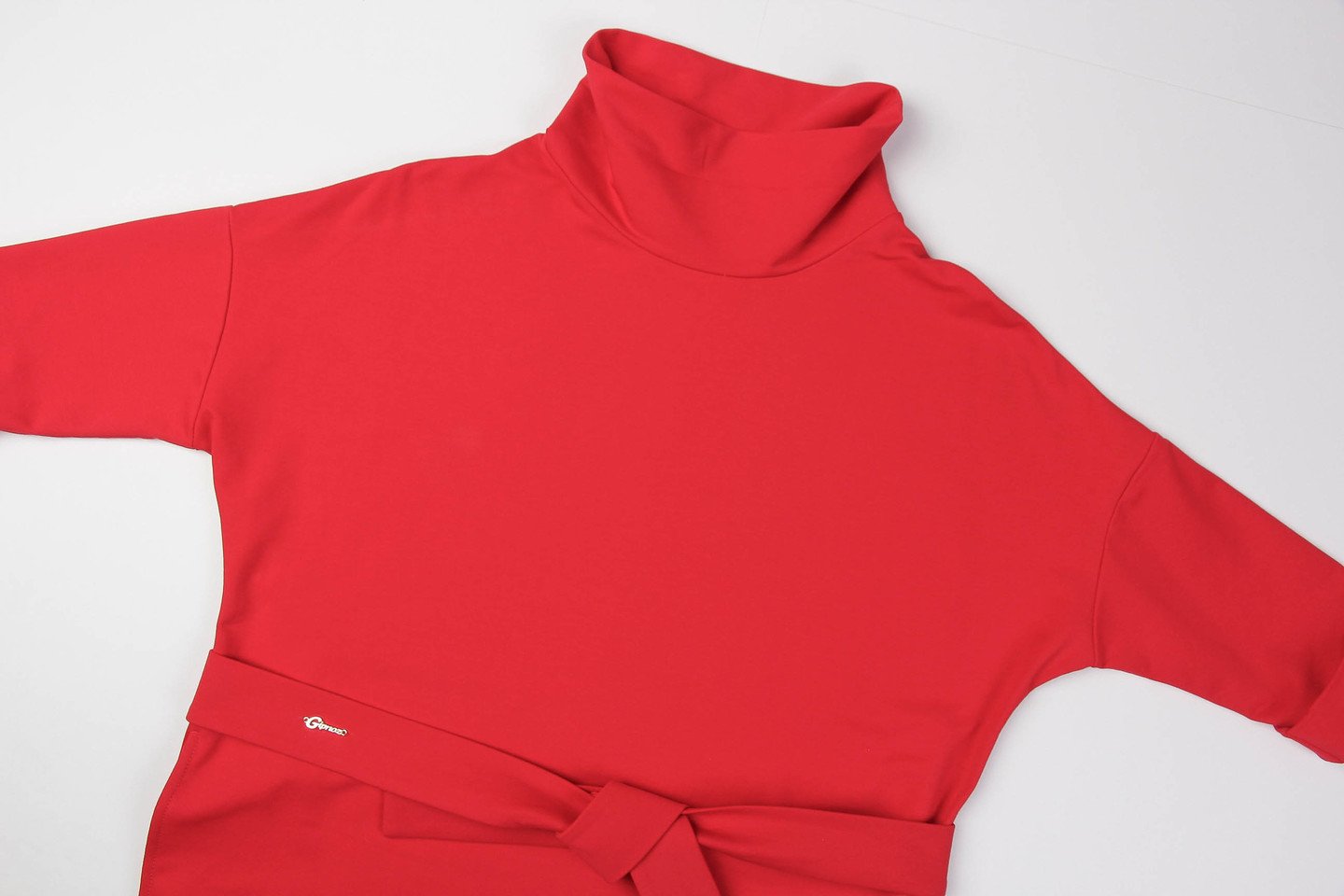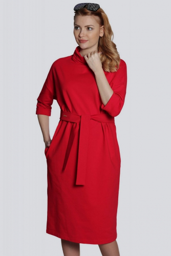 Элегантное офисное платье свободного объема имеет покрой со спущенной линией плеч. Платье отлично сидит на фигуре любого типа телосложения, пояс подчеркивает линию талии. Воротник мягкая стойка и манжеты на рукавах придают образу немного строгости. Состав трикотажа: 75% хлопок, 20% полиэстер, 5% спандекс. красный