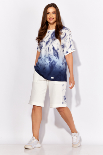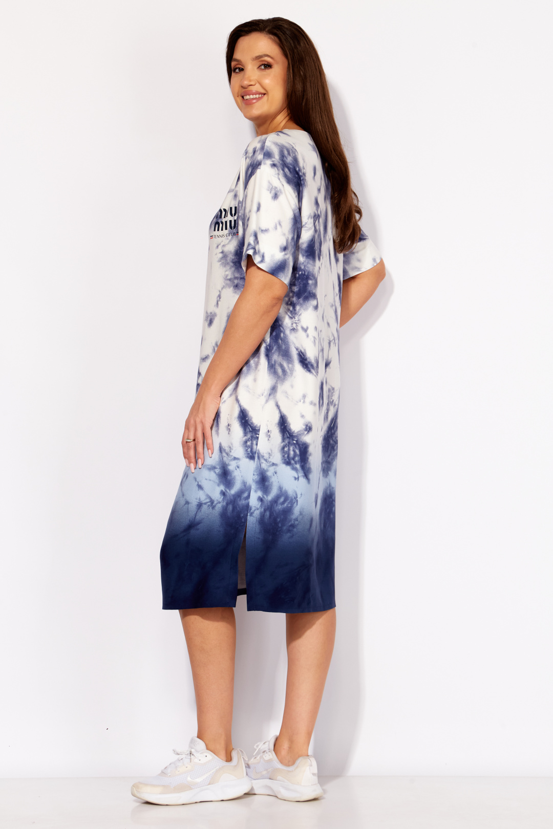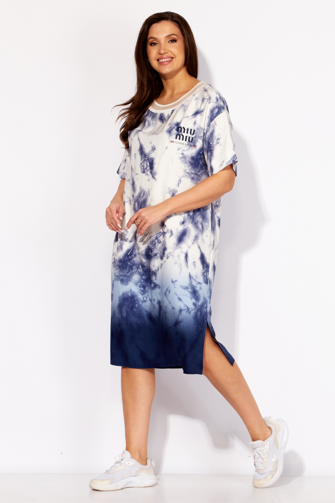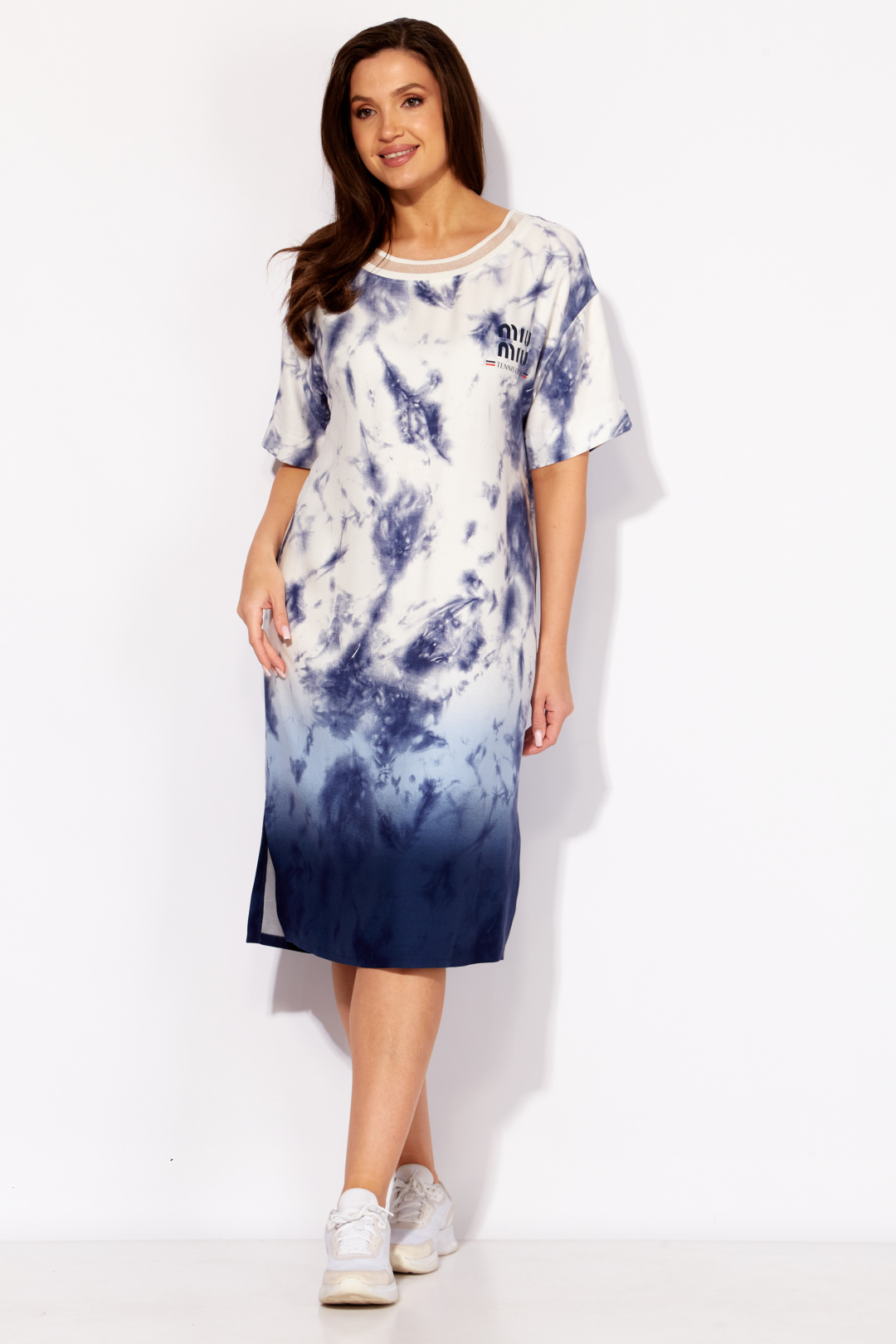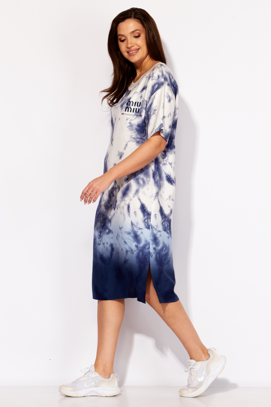 Женское платье прямого силуэта с эффектным трикотажным принтом, имитирующим текстуру мрамора в тонкой гамме синего и белого цветов. Модель с короткими рукавами и спущенной линией плеч создает расслабленный, но при этом стильный образ. Горловина округлой формы добавляет изысканности. Акцент на передней части в виде декоративного принта усиливает визуальное воздействие. Вертикальный принт на передней части слева визуально стройнит силуэт. Задняя часть платья выполнена без декоративных элементов, сохраняя элегантность и простоту дизайна. Это платье идеально подходит для дневных и вечерних мероприятий, обеспечивая комфорт и уникальность образа.