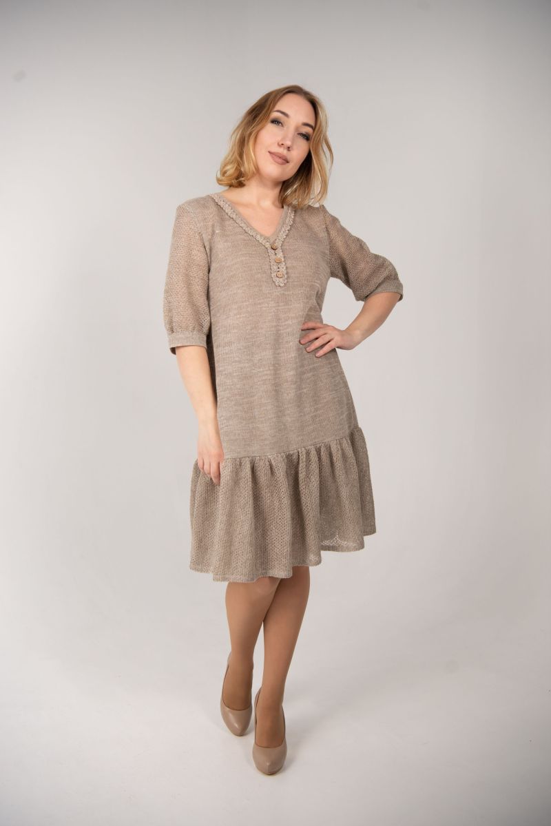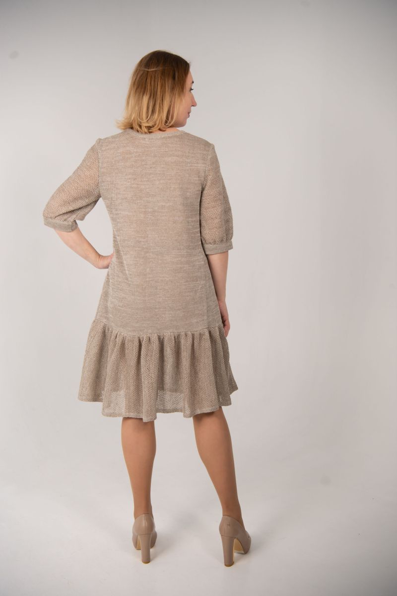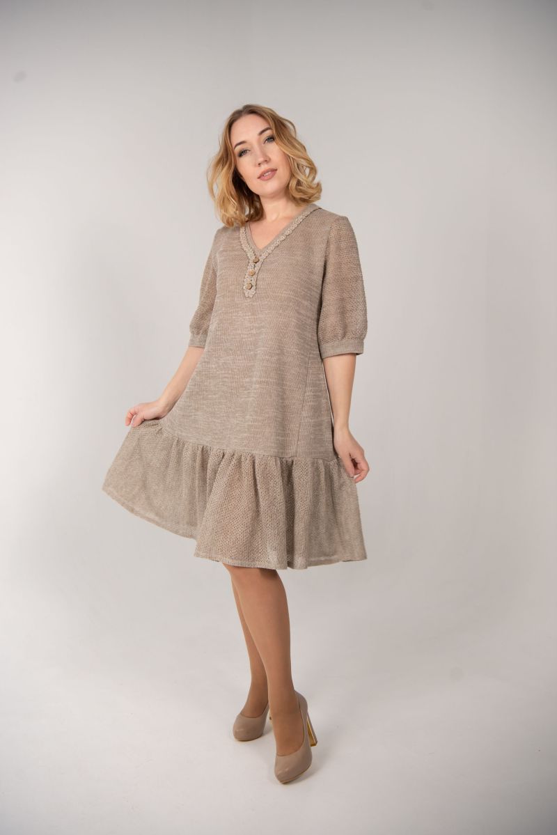 Описание: Платье с оборкой внизу, рукав на сборке, отделка крючок, пуговицы, трикотаж.