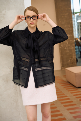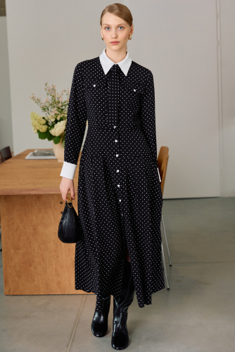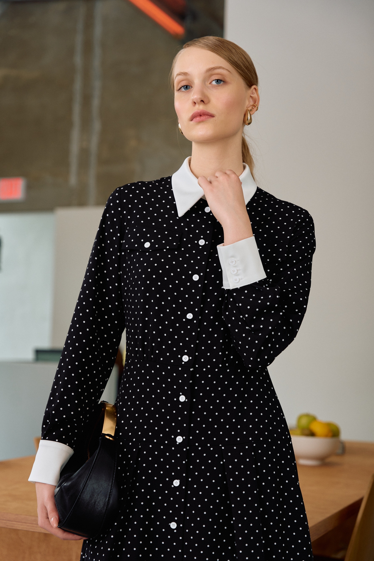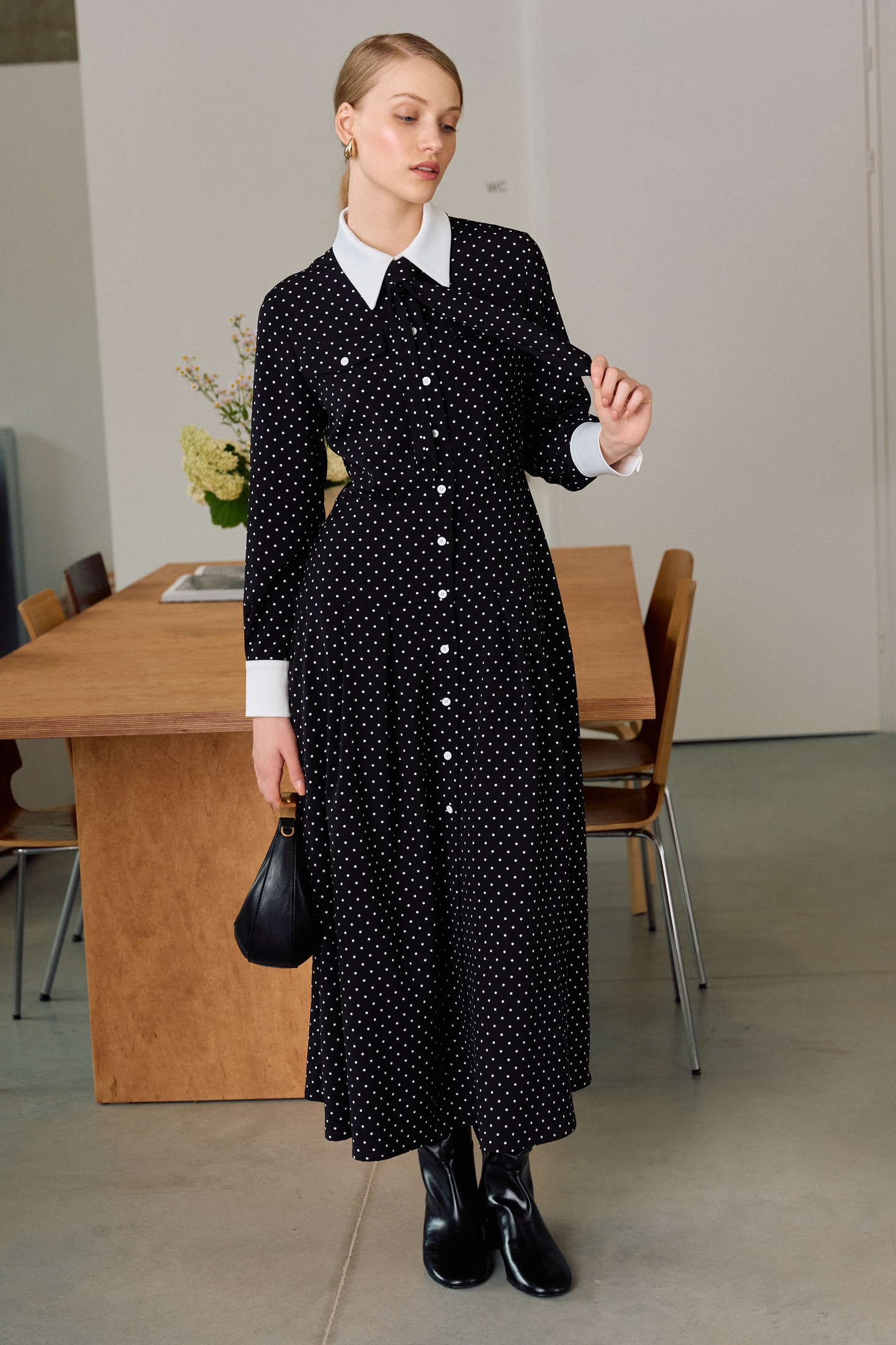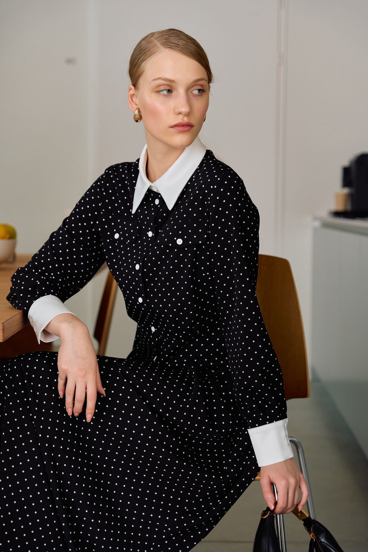 Элегантное чёрное платье в пол с белым гороховым принтом создаст безупречный образ в любой ситуации. Модель обладает рубашечным воротником из отделочной ткани, что добавляет изысканности. Втачные длинные рукава завершаются манжетами на пуговицах, подчеркивая тонкость стиля. Линия талии акцентирована отрезной деталью как спереди, так и сзади, оптимально моделируя силуэт. Застежка расположена спереди и укомплектована декоративными клапанами выше линии груди. Функциональные прорезные карманы по бокам добавляют удобства. Платье дополняет утончённый галстук, гармонирующий с общим дизайном и повышающий его стильность. Это изделие выглядит одновременно традиционно и современно, идеально подходит для создания выразительного офисного или повседневного наряда.