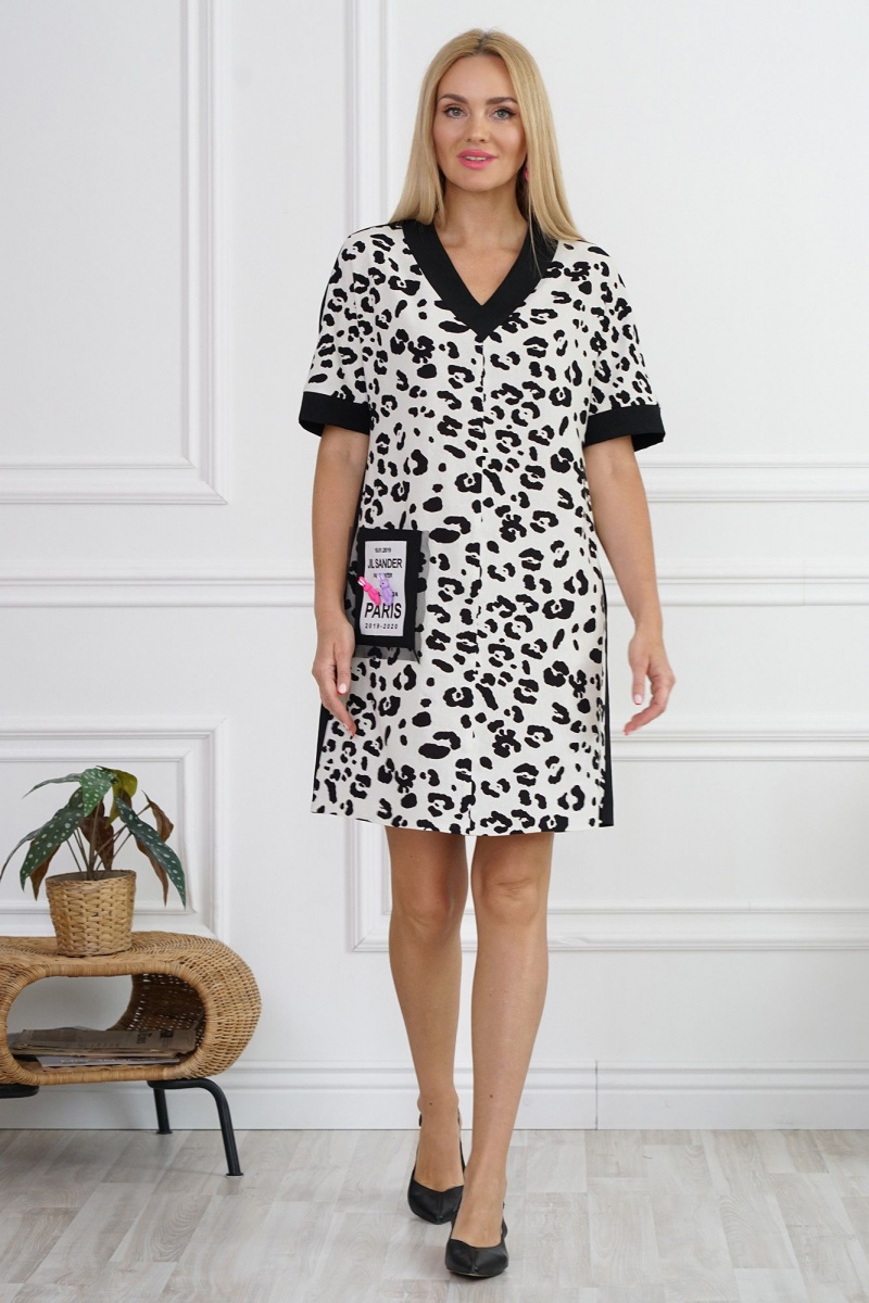 Платье женское прямого, свободного силуэта, с цельнокроеными короткими рукавами понизу с притачными манжетами. Вырез горловины V – образной формы с притачной планкой.