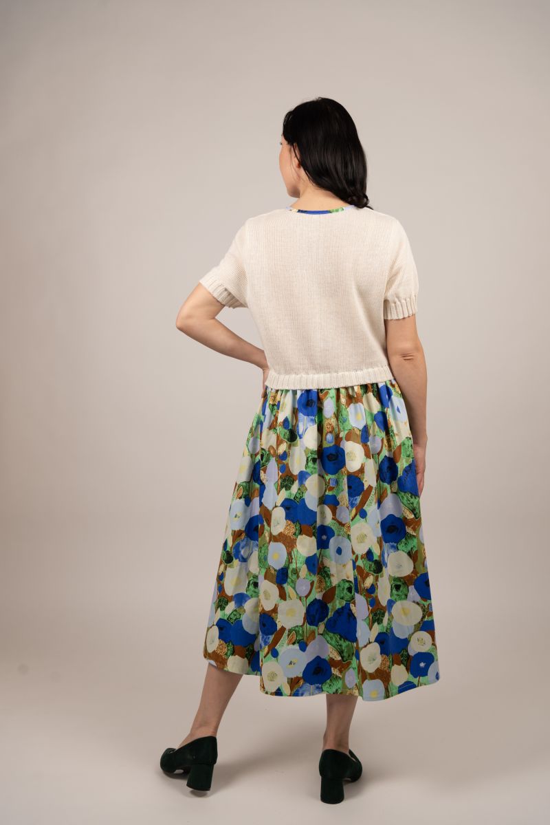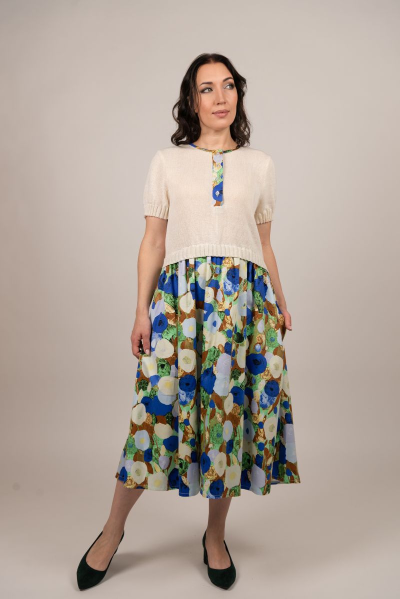 Описание: Платье с коротким рукавом, верх трикотаж лен, низ ткань хлопколен, складки, в боковых швах карманы.
