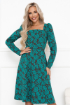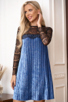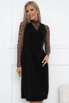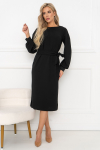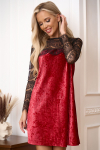 Нарядное платье понравится поклонницам ретро-силуэтов. Модель выполнена из плотного тянущегося трикотажа двух оттенков. Облегающий лиф красного цвета украшен широкой баской с черным кружевом, длинные рукава доходят до запястий. Черная прямая юбка длиной до середины колена подчеркивает линию бедер.