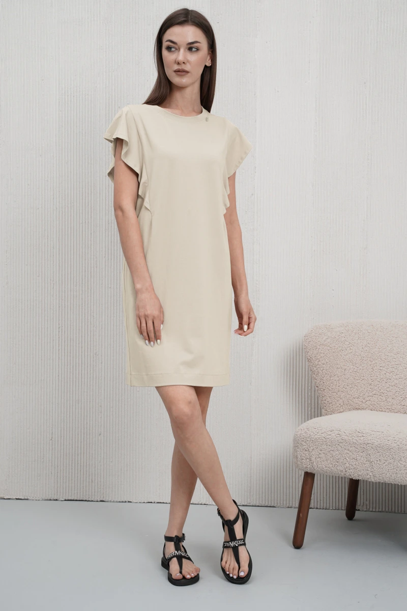 Один из самых комфортных, расслабленных и неформальных видов платьев - платье-футболка. Внешне оно напоминает футболку, но имеет длину, достаточную для самостоятельного ношения. Свободный упрямлённый силуэт, круглый вырез  и интересный смещённый подрез, в который вставлена оригинальная деталь, которая одновременно решает декоративную функцию и функцию частичного рукава. Невероятно комфортное хб трикотажное полотно с небольшим добавлением эластана, в общем эта модель влюбляет себя с первого взгляда. Длина около 94 см.