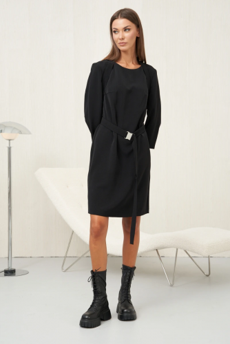Даже если женщина предпочитает спортивный стиль, в её гардеробе обязательно найдётся хотя бы одно платье. И хорошо, когда это платье универсальное, удобное, носить которое можно в разных вариантах, подходящее для разных мероприятий, меняющее образ своей обладательницы в зависимости от настроения. Предлагаем вам обратить внимание на такое платье силуэта в базовом цвете. Платье с втачными рукавами длиной 34 с локтевой вытачкой. Вырез горловины овальной формы. По переду - нагрудные вытачки. Спинка с центральным швом и плечевыми вытачками, идущими из линии горловины. По центру горловины спинки - отделочная пата, через которую продевается съёмный декоративный пояс, застёгивающийся спереди на серебристую пряжку. Длина платья по спинке около 92 см. Длина рукава около 48 см.