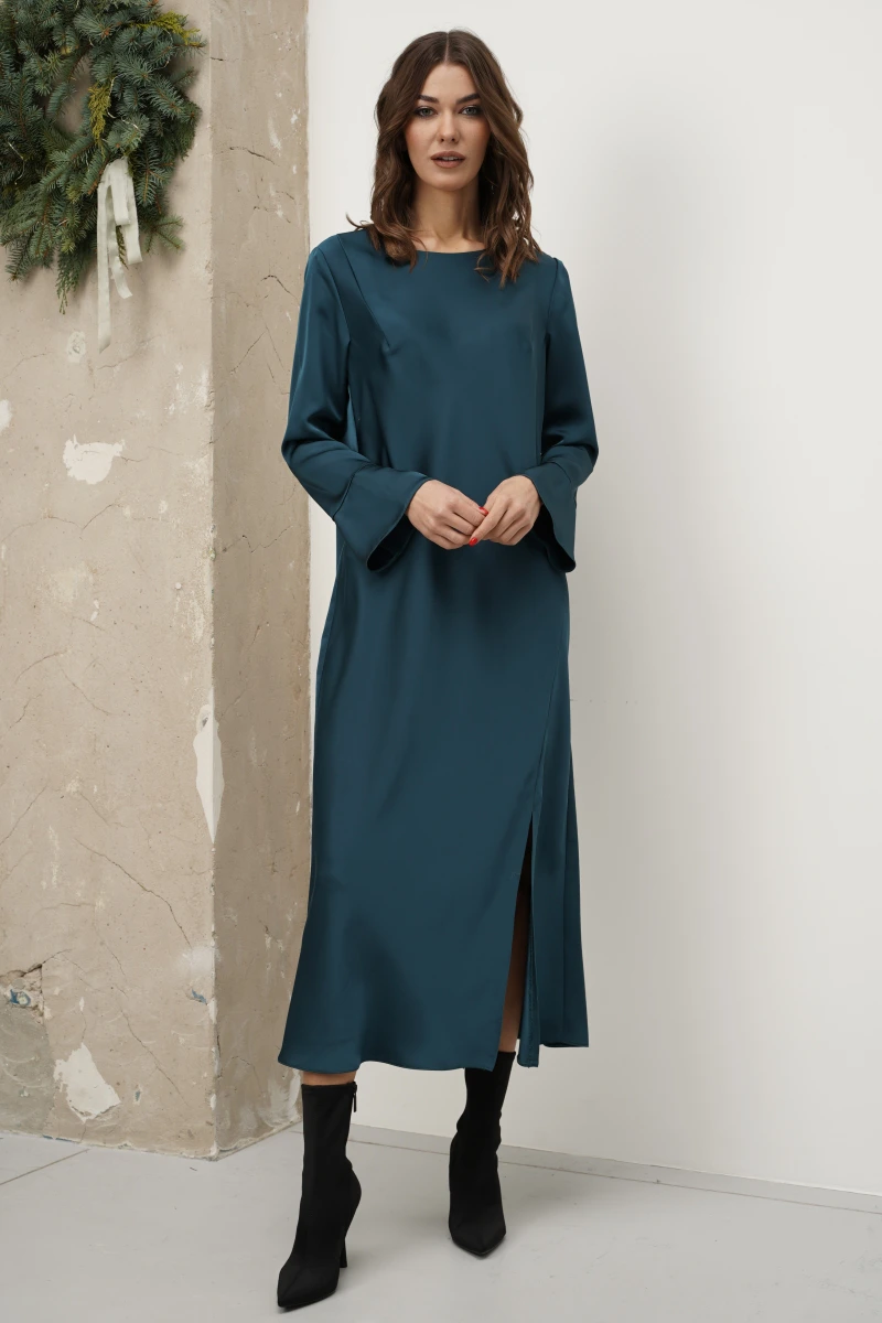 Мир моды сегодня разнообразен безгранично, поэтому, выбирая платье, главное помнить - вы в нём должны быть красивой, а не модной.Изысканное длинное платье из плотного матового сатина словно ниспадает вниз, изящно подчёркивает линии силуэта, при этом оставляет загадку: что же скрывается под этим великолепием!Свободный упрямлённый А-силуэт, втачной покрой, горловина лодочка.Полочка с нагрудной вытачкой от линии плеча, боковым асимметричным подрезом с высоким разрезом.Спинка с центральным швом и потайной молнией. Рукав втачной с локтевой вытачкой и отрезным коническим воланом.Длина платья около 128 см, длина рукава около 62 см.