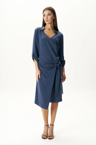 Модное платье длины миди - это идеальный выбор для любого торжества. Роскошное наполнение лаконичных форм - эта идея воплощена в необыкновенно женственном полуприлегающем силуэте лифа и романтичной конической юбке.Покрой - втачной, воротник - апаш, рукав - двухшовный. Полочки с центральным швом и вертикальными рельефами, лиф спинки как бы повторяет полочку.Нижняя часть платья - коническая. Модель дополнена съёмным поясом с пряжкой.Длина платья около 110 см, длина рукава около 60 см.