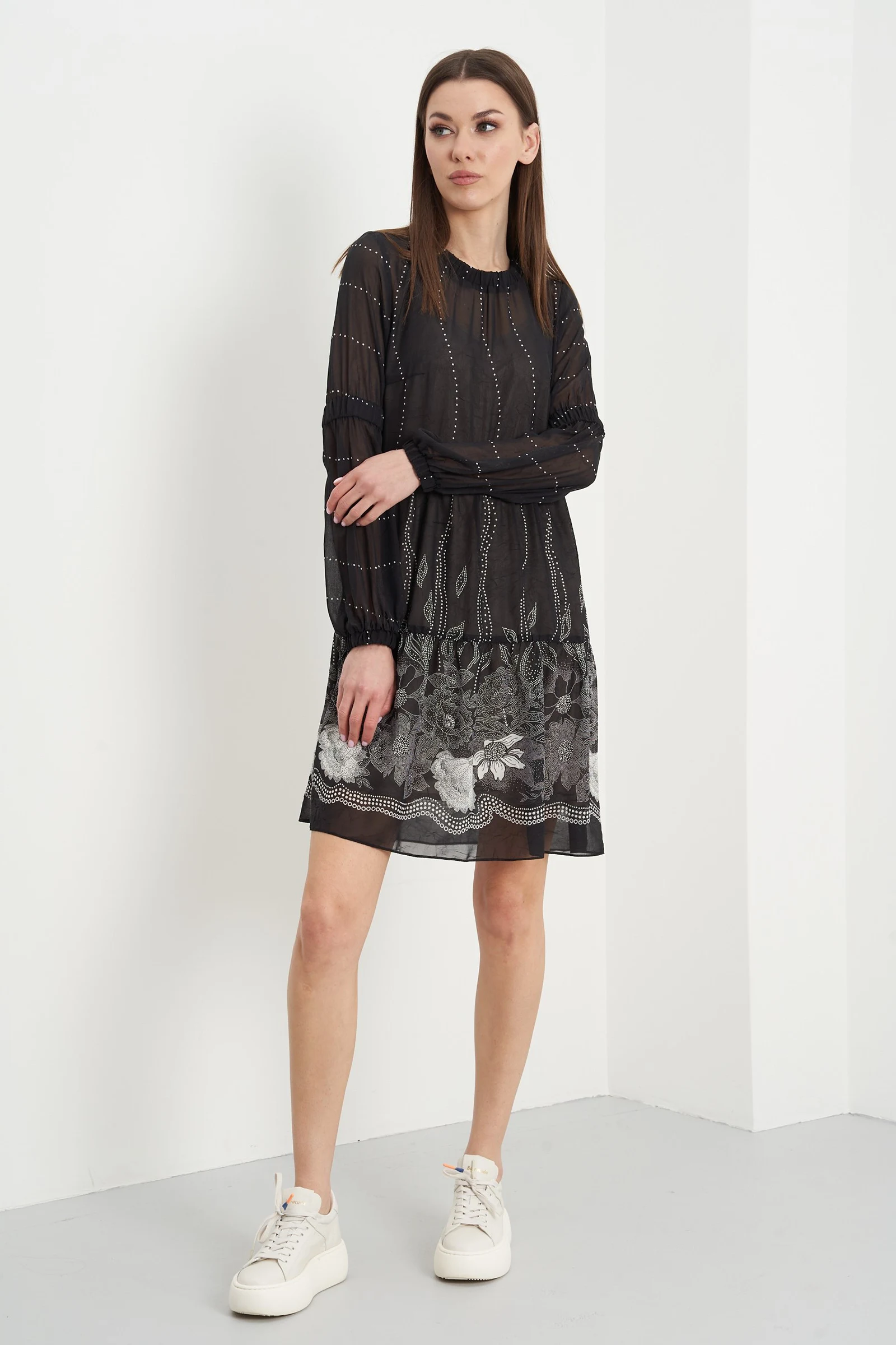Шифон - это идеальная ткань для пошива весенних платьев. Платья, выполненные из этого материала, выглядят элегантно и игриво, особенно если это платье в романтическом стиле. Нежное и воздушное, с каскадом расширяющихся воланов с легкой сборкой, свободного силуэта. Рукав втачной из двух частей с эластичной тесьмой в верхней части и по низу. Горловина изделия с декоративной отделкой со сборкой. Длина изделия около 86 см. Длина рукава около 61 см.