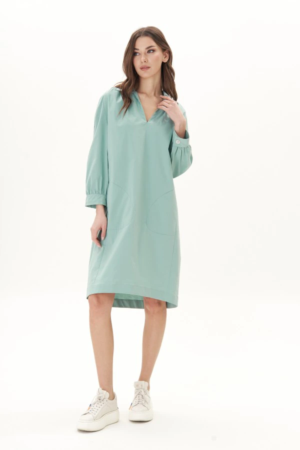 На ряду с брючными комплектами, платья в минималистично-сдержанной стилистике уверенно занимают свою нишу в модном весеннем гардеробе. Ведь это универсальное решение на все случаи жизни: куда бы вы не отправились, в таком платье вы всегда на высоте.Простой лаконичный силуэт, сложный комбинированный покрой, стояче отложной воротник. Полочка с отрезными бочками, карманами в рельефе, сборкой по плечевому шву.Спинка с отрезной кокеткой, сборкой по линии притачивания воротника и отрезным наклонным бочком.Рукав-полуреглан спереди и цельнокроенный на спинке. Рукав 34 на отрезной манжете. Линия низа - ассиметричная.Длина платья около 102 см, длина рукава с плечом около 61 см.